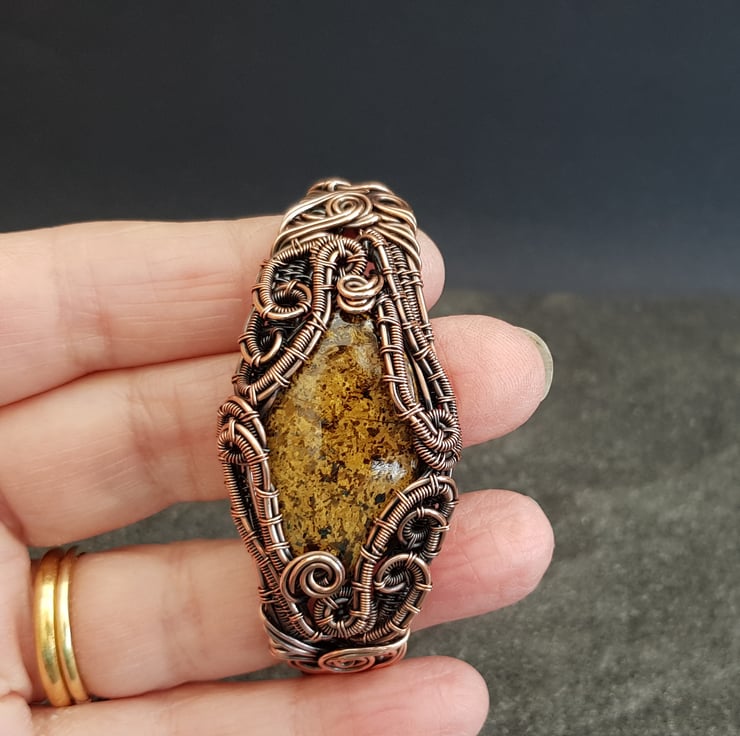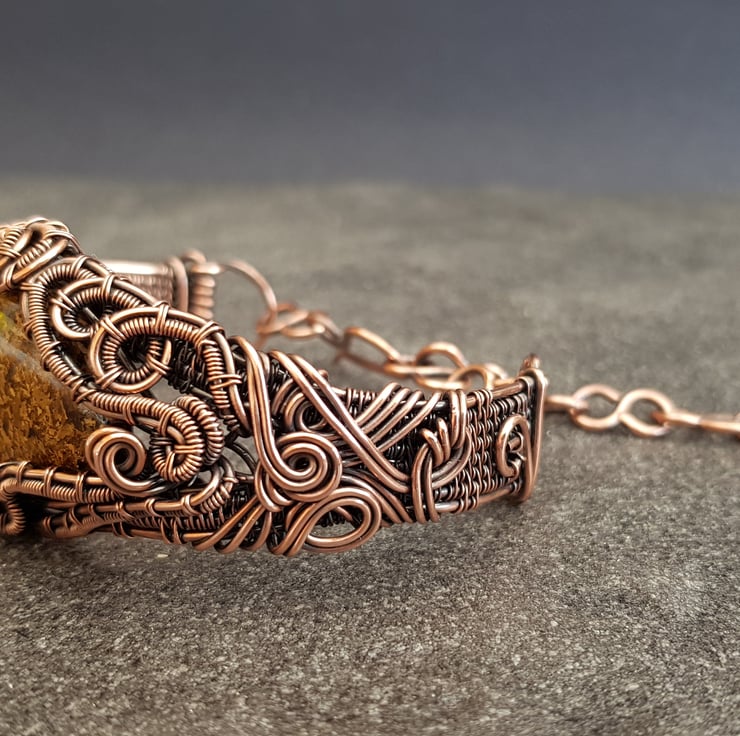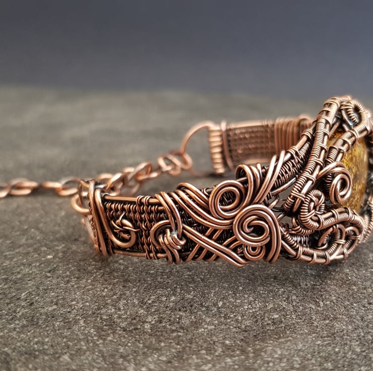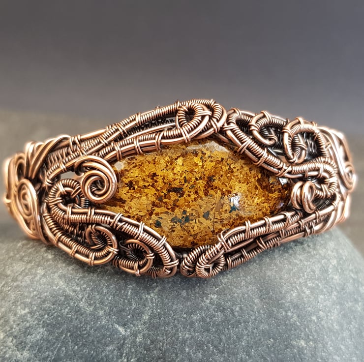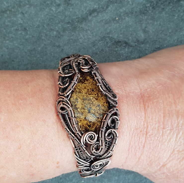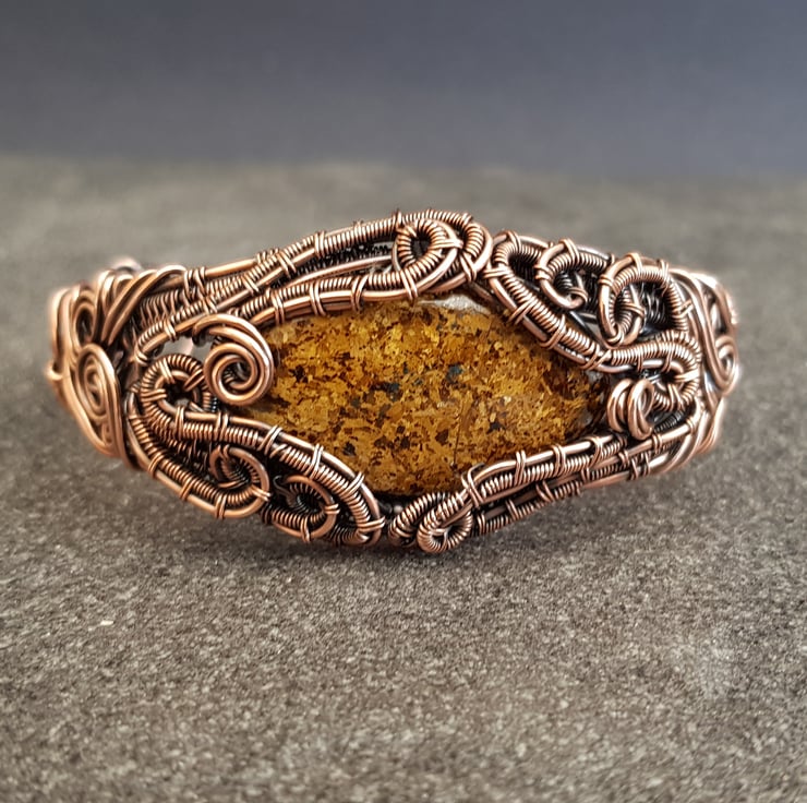 This copper cuff style bracelet has been hand woven using solid copper wire with a bronzite stone at the centre.