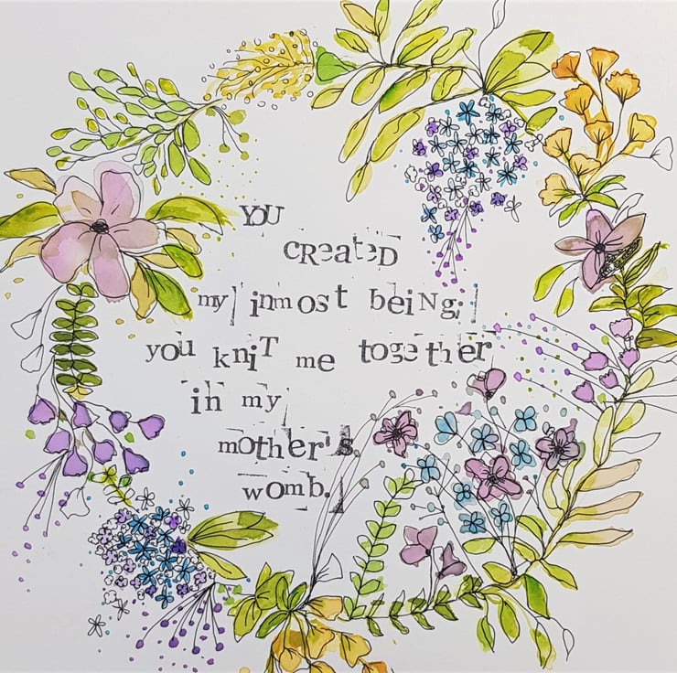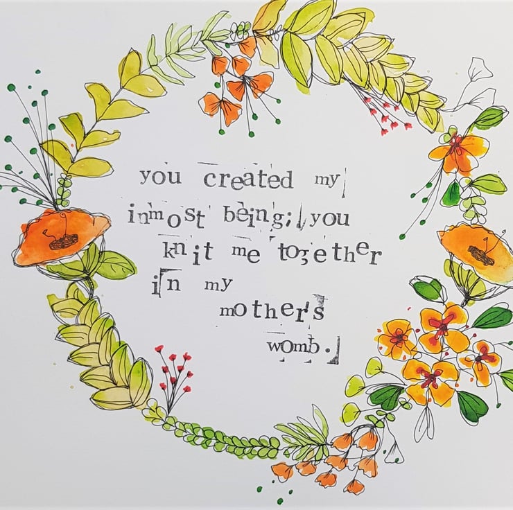 Each wreath is painted by hand on high-quality A4 watercolor paper, with a personalised quote hand stamped in the center. Please take a look through the gallery to get a feel for the style that I create, and let me know what colours and flowers you would like incorporated into your design.