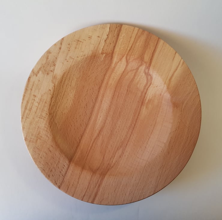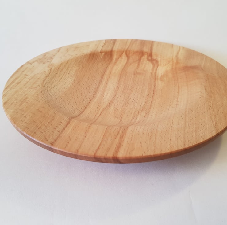 Spalted beech Platter, 222mm x 34mm High, finished in Danish oil. A nicely figured spalted beech platter, with a nice wide rim and ogee back. The spalting makes nice streaks and the brown pips in the beech are striking.