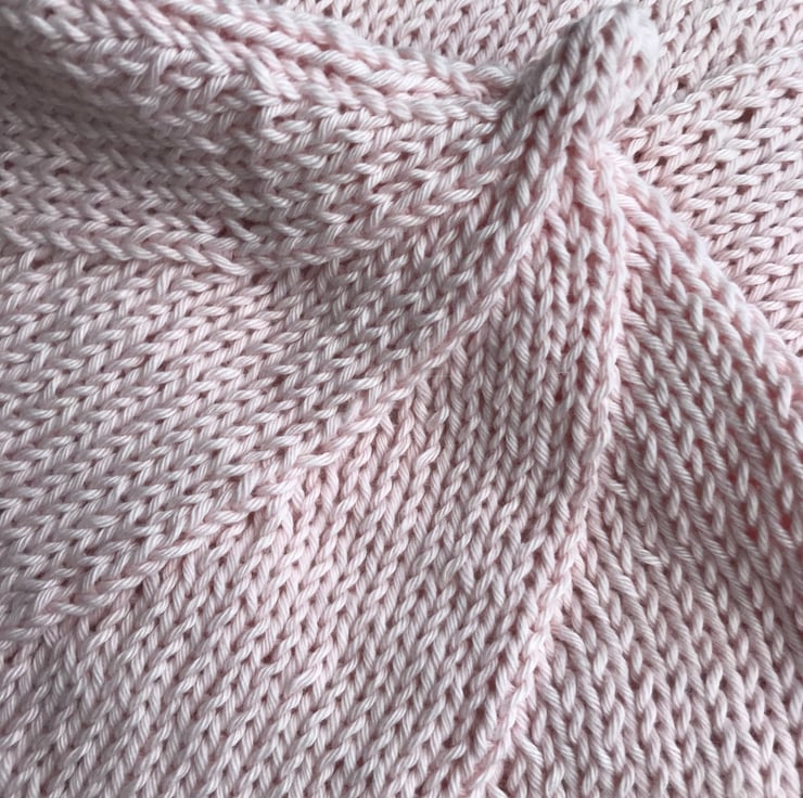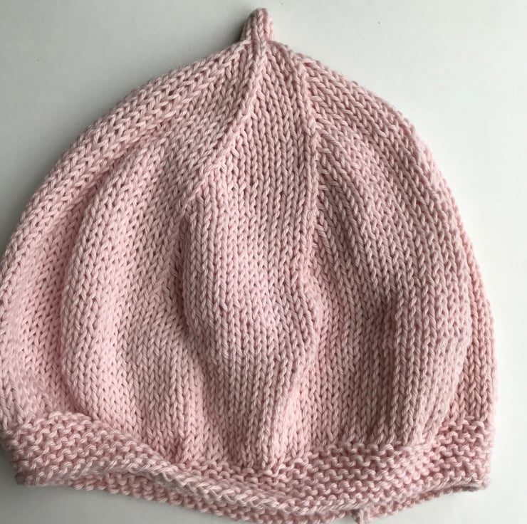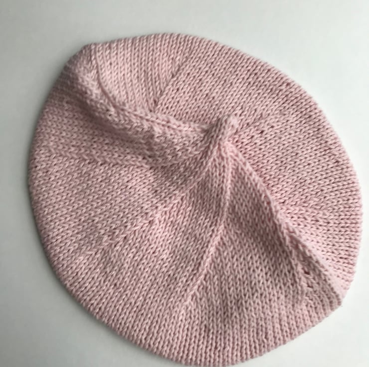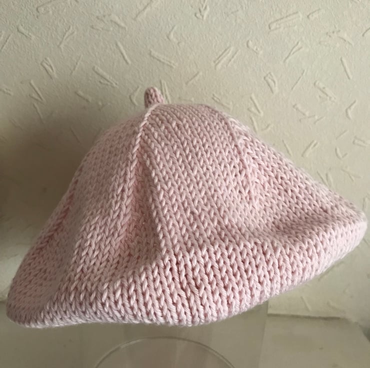 A pale pink beret hand knitted in a soft cotton and acrylic yarn. This stylish beret has a stalk at the top.