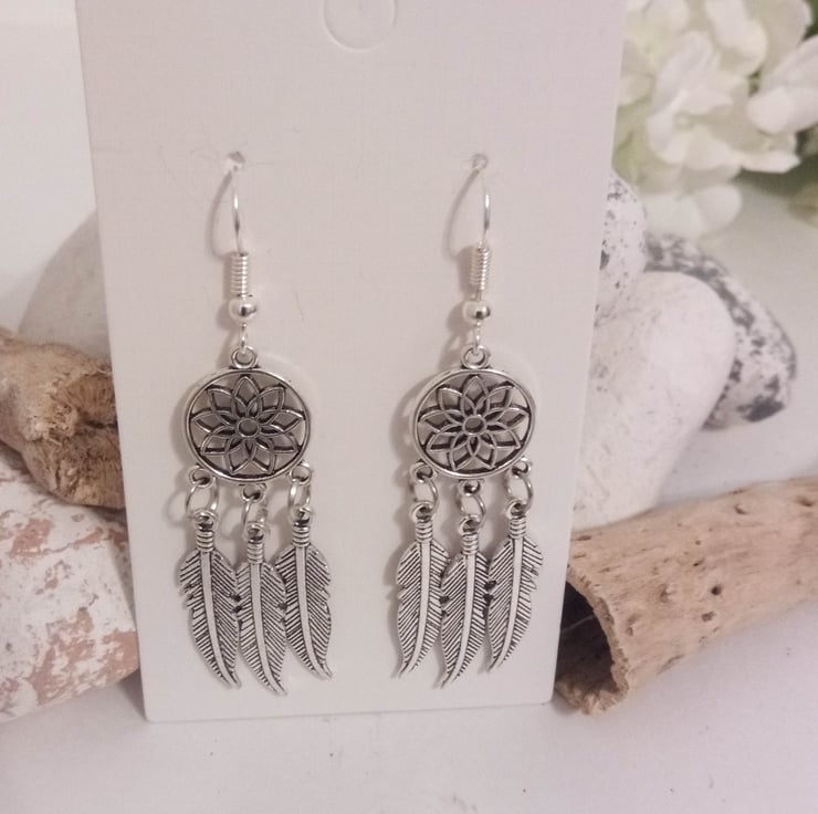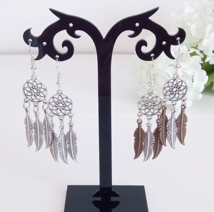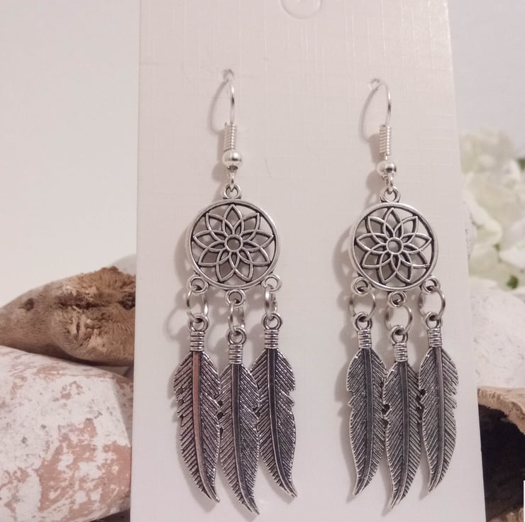 These lovely dream catcher earrings hang from silver plated earring fish hooks, and feature flower design dream catcher pendants, each with three silver plated feathers hanging from them.
