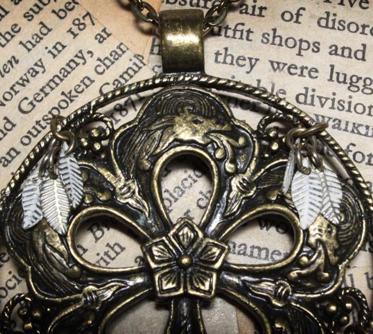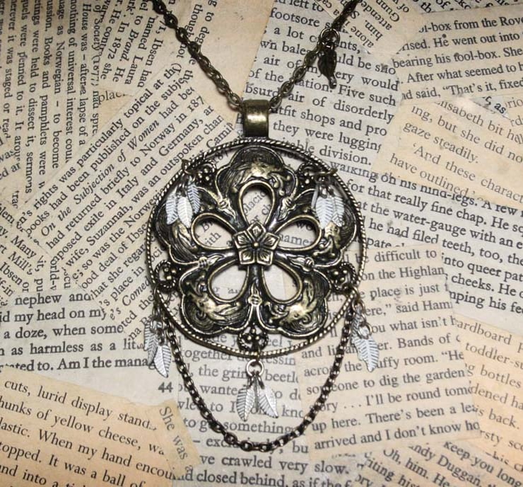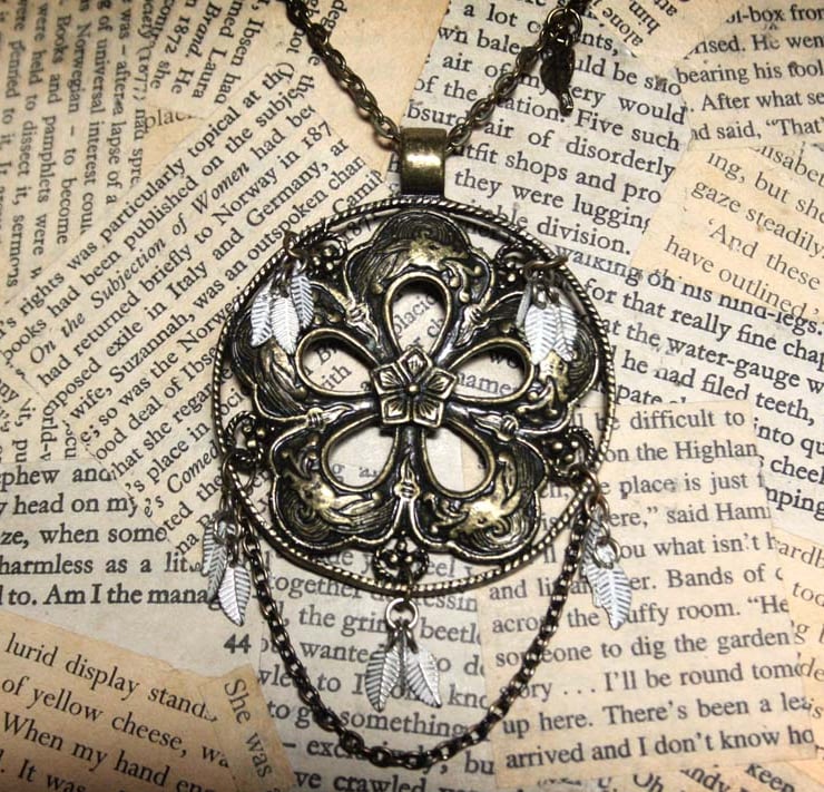 This large stylised flower pendant has been accented with the addition of cream and antique gold leaf charms. On closer inspection, the petals of the flower feature Chinese style dragons.