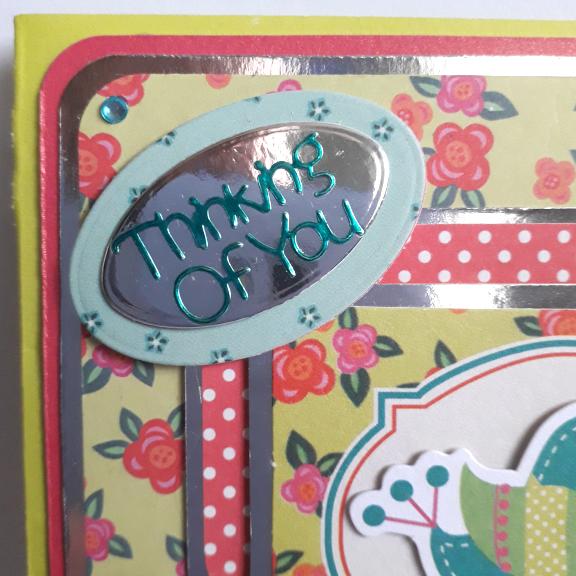 The birdie topper has been placed onto two toning patterned panels, then a rose patterned paper, silver card, pink card and a lime green base card. I have wrapped a pink ribbon around the bottom panel and a die cut flower and leaves to the opposite side, there is a gem in each corner.