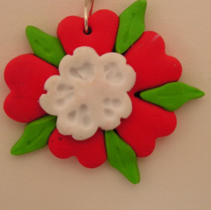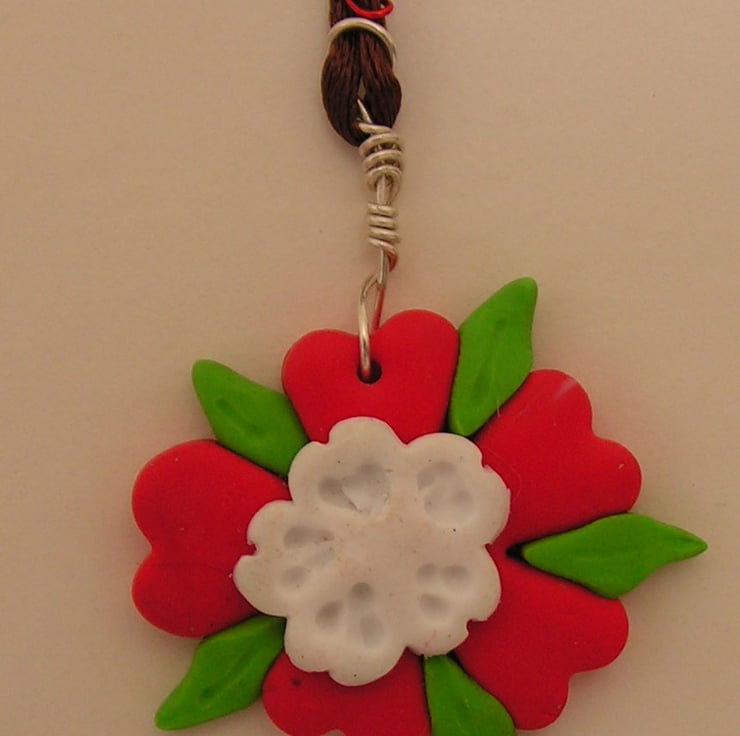 This is a handcrafted tudor rose created using sculptured polymer clay fastened to a brown silk thread and finished with handcrafted sterling silver S clasp findings. The tudor rose is a symbol of union between the Yorkists and the Lancasterians ending the 100 year war.