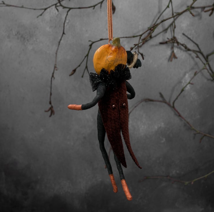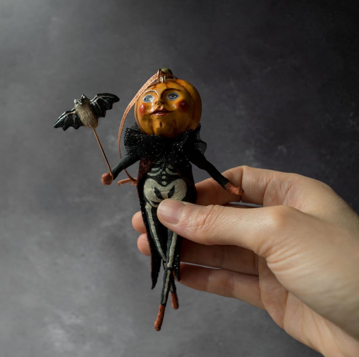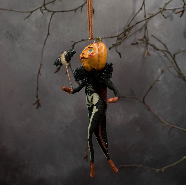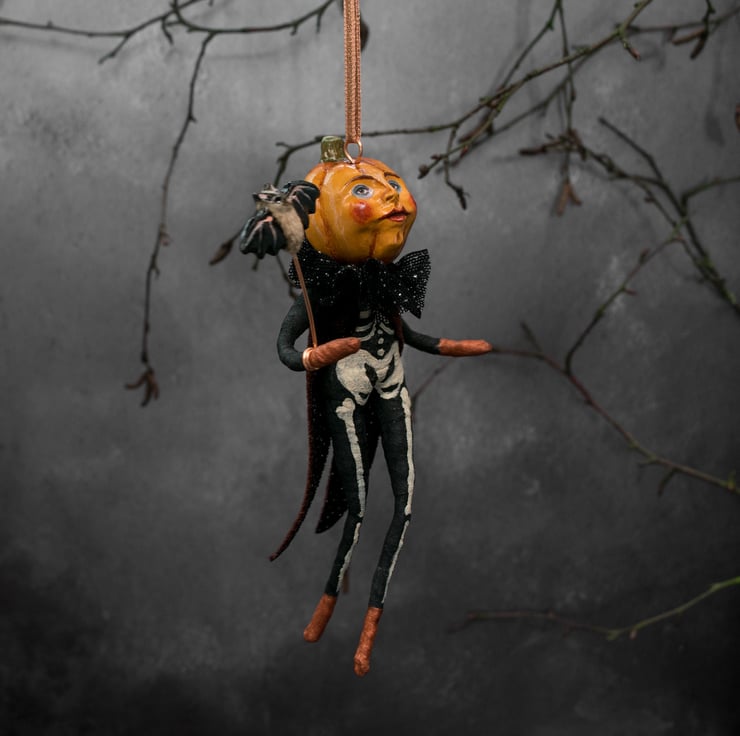 Peter pumpkin fresh from the pumpkin patch! He has been designed for Halloween with his skeleton costume and little bat, but he can be displayed all year round too for your admiration.Hang him from your decorative tree, mantelpiece, etc.