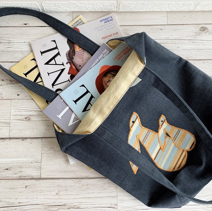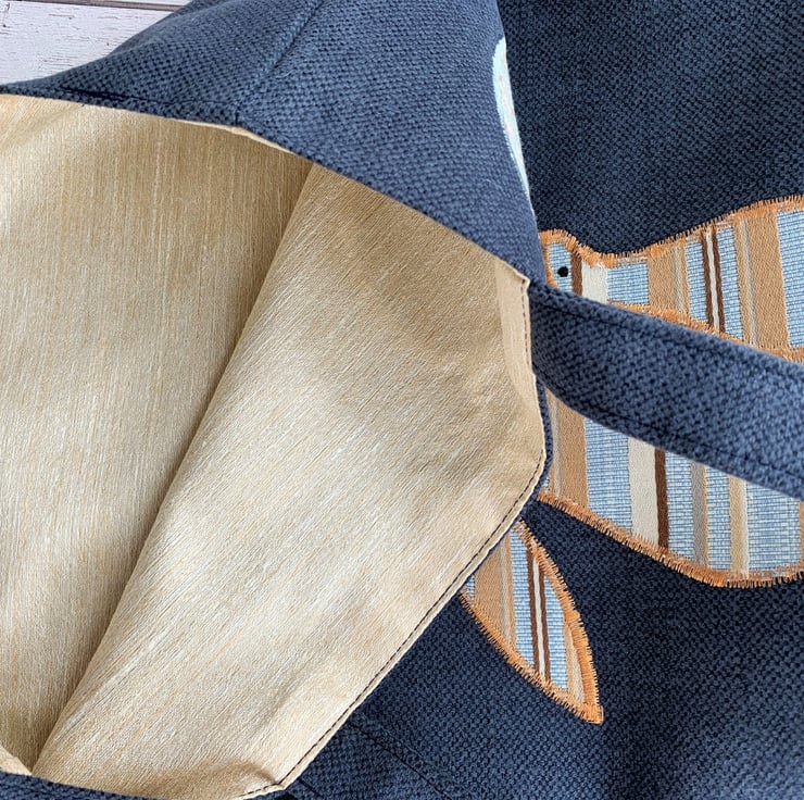 A lovely tote bag in navy blue fabric with an appliqué scene depicting two hares gazing at the moon. The two moon gazing hares are made from striped fabric in shades of pale blue, beige, gold, brown and cream. I've added tiny black sequins for eyes. The large full moon is made from a pale duck-egg blue fabric with a beautiful swirled silver woven pattern with a slight sheen. The bag is fully lined with cream fabric with a slight sheen.
