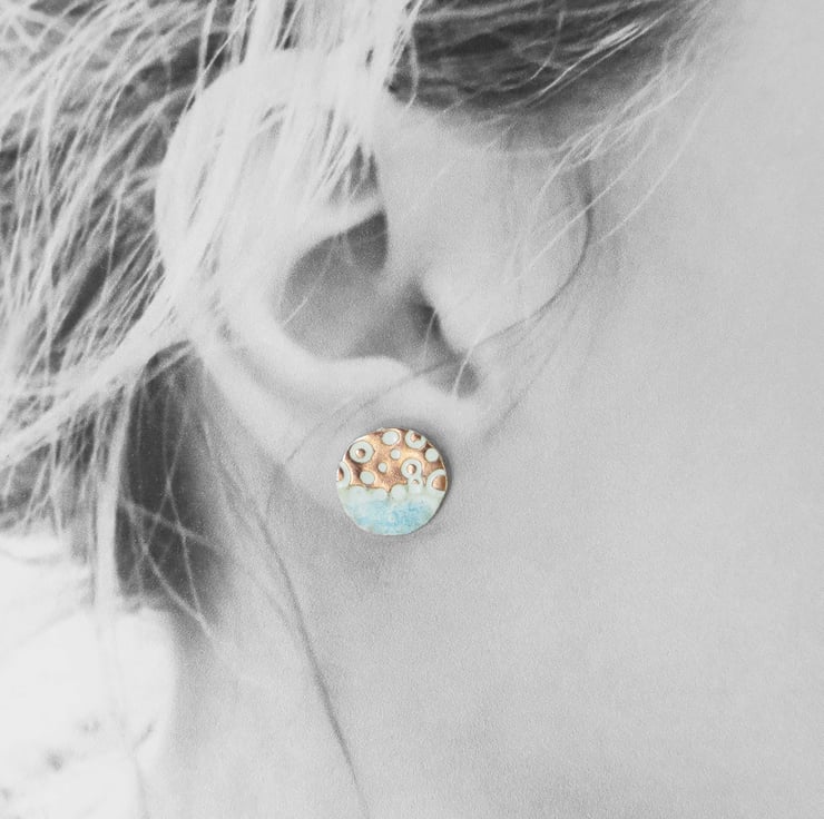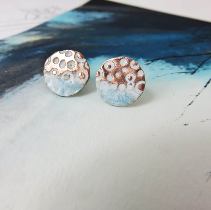 13mm circle copper stud earrings decorated with a daisy texture and washed with white and blue enamel. Some raised areas are sanded back to reveal the copper beneath. Silver posts are soldered on the backs. Fired in the kiln at 830 degrees. Posted out in a gift box with information about the enamelling process.