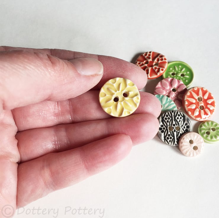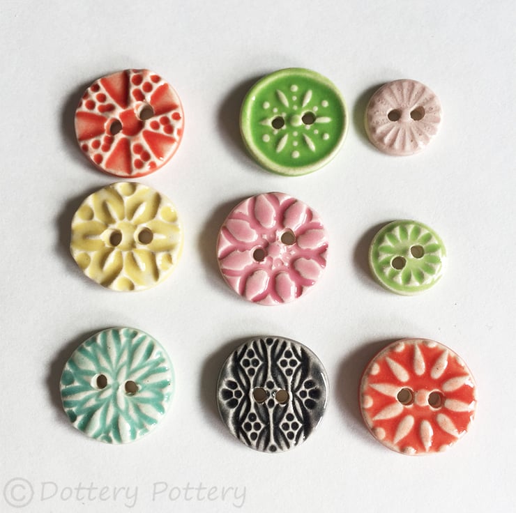 This set of nine pottery buttons are made from white earthenware clay, embossed and glazed on the front. They are then fired to 1100 degrees, so nice and strong. Small Button size 18mm across and 3mm deep, teeny button size 12mm across and 3mm deep. They can be handwashed or machine washed on a low temperature. Perfect for all sorts of arts and craft projects