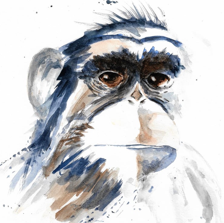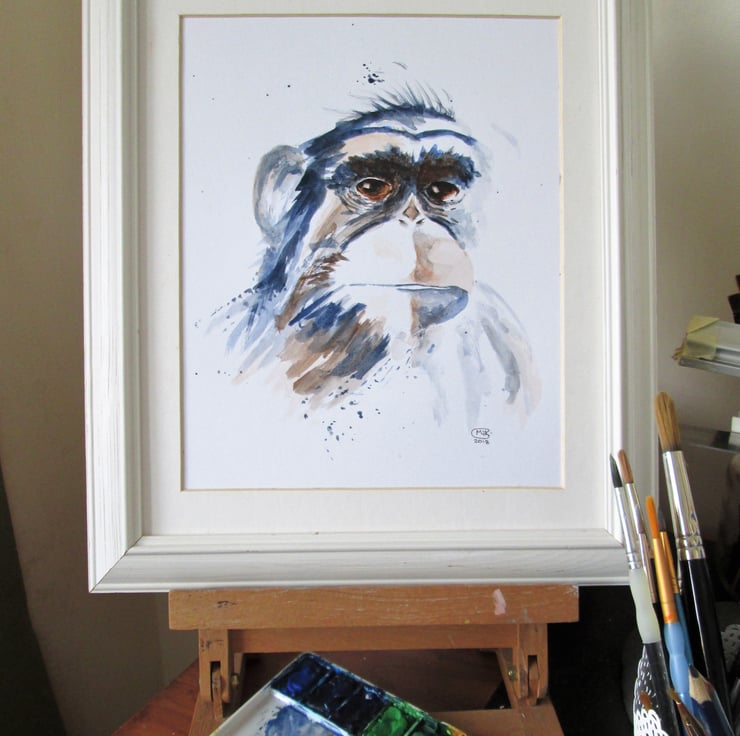 An original watercolour painting on quality white paper of a chimpanzee with attitude.