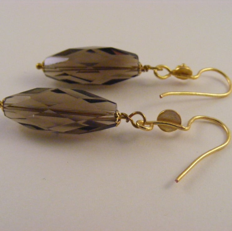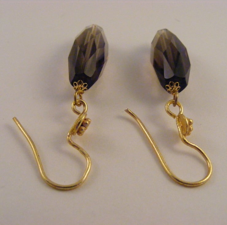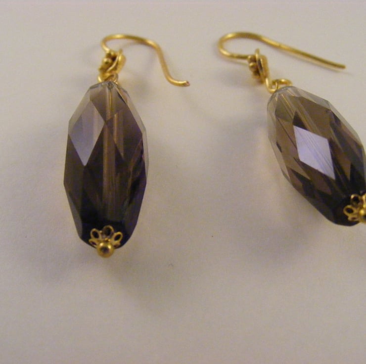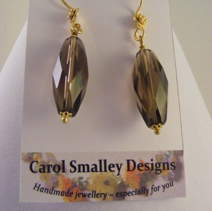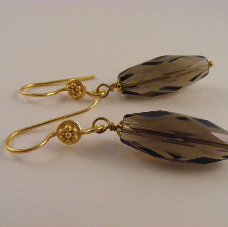 One of a kind gemstone earrings, handmade with, 28 x 10 mm smoky quartz rice beads, 3 mm gold plated bead caps, headpins and flower ear wires.