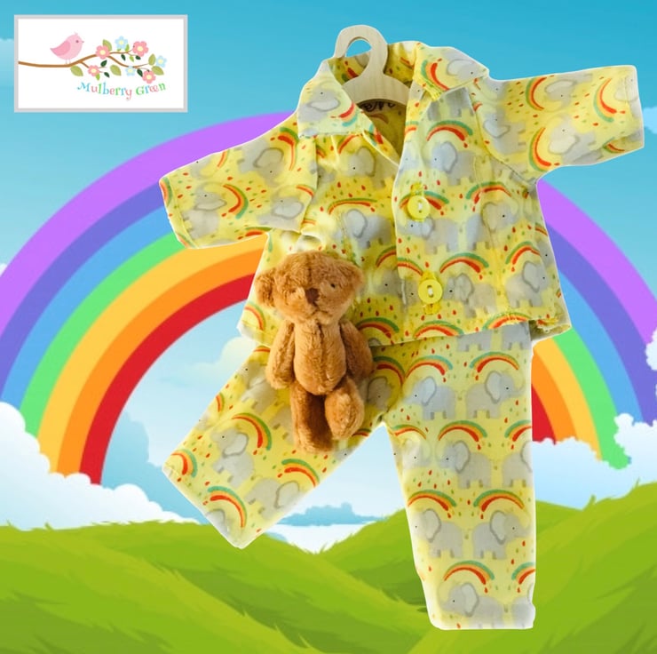 A totally cute little pair of rainbow pyjamas to fit the Mulberry Green characters. The pyjamas are lemon with a baby elephant and rainbow print and are tailored like real pyjamas. They fasten with two little yellow buttons and come on a cute little wooden hanger. The pyjamas come with an adorable tiny teddy bear, just the right size for the Mulberry Green characters.