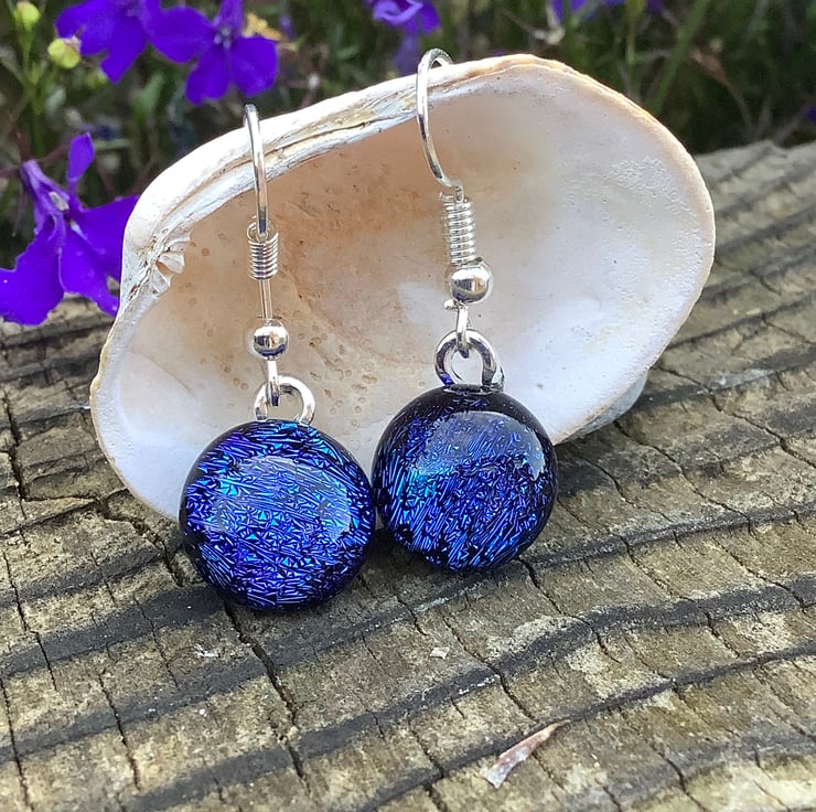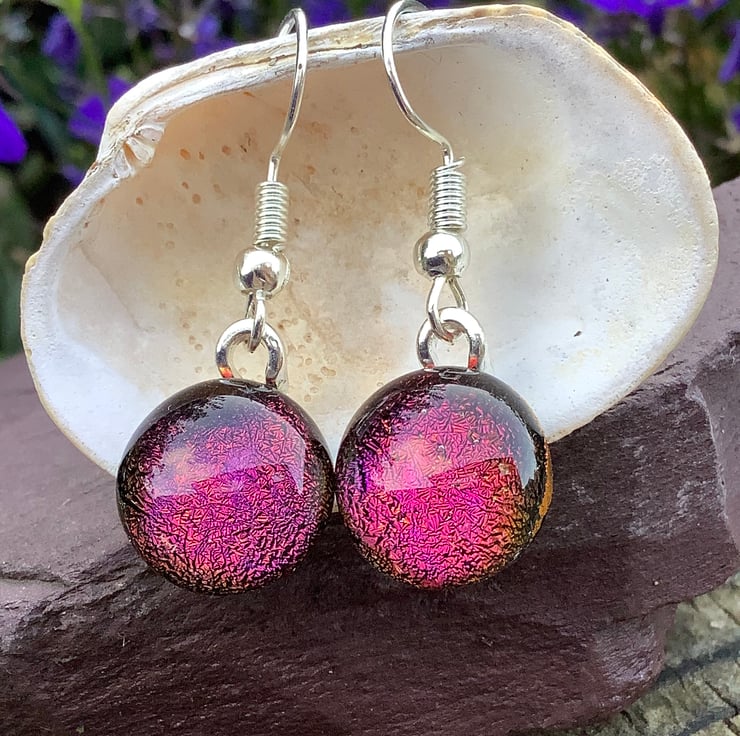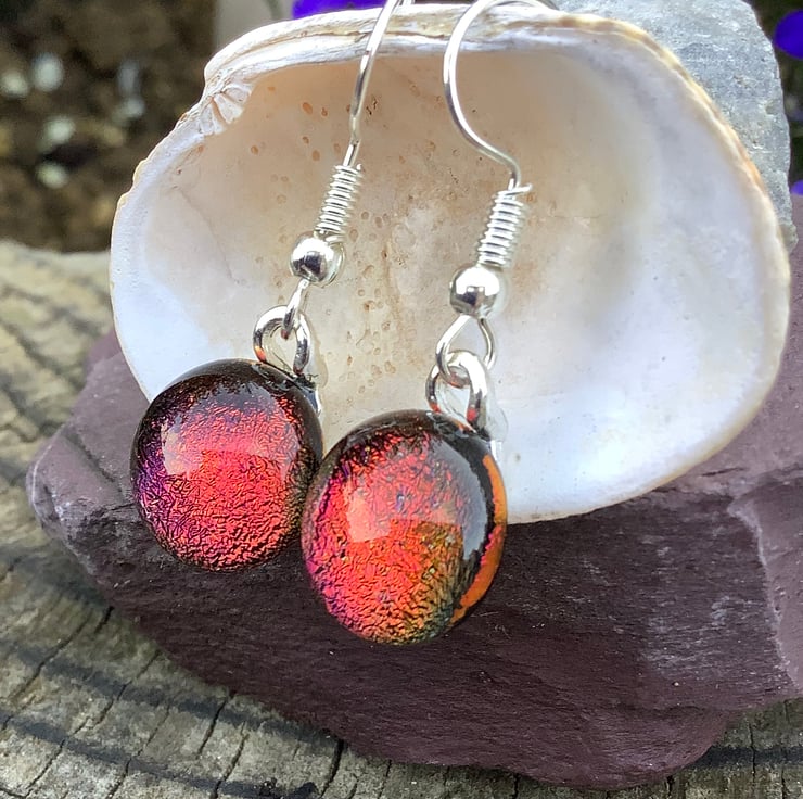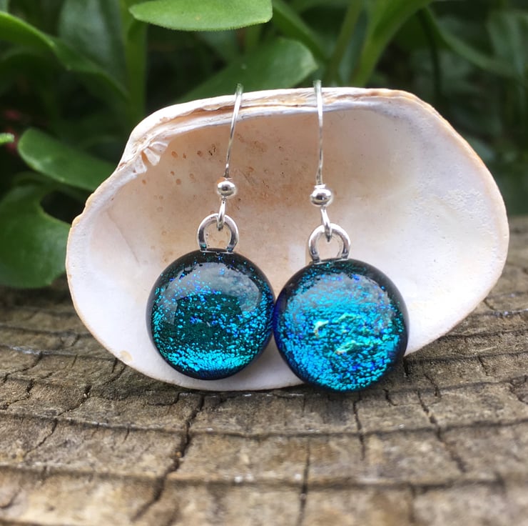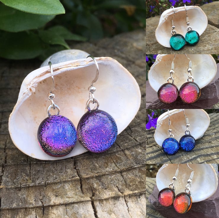 These beautiful earrings are handmade by fusing clear and dichroic glass together in a kiln at a high temperature. The glass is cut to shape, fused and then finished off with a silver plated bail and silver plated ear wires. They are approximately 1cm round and come in a variety of striking colours.