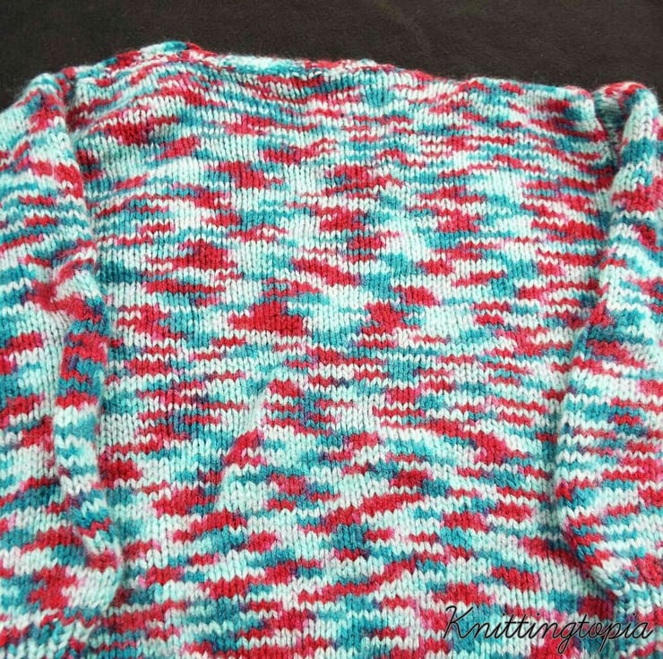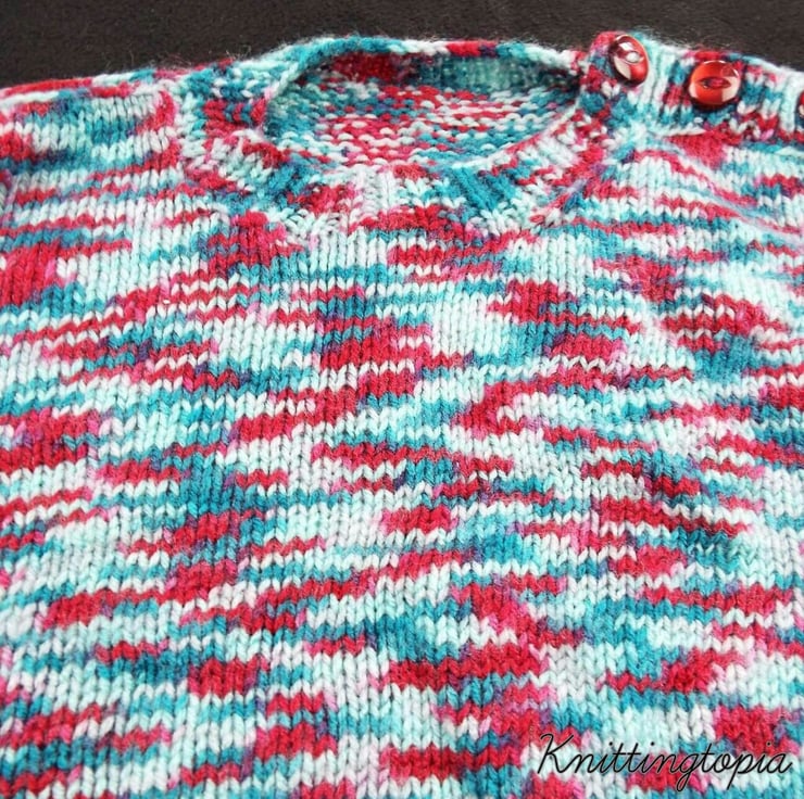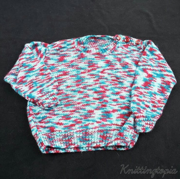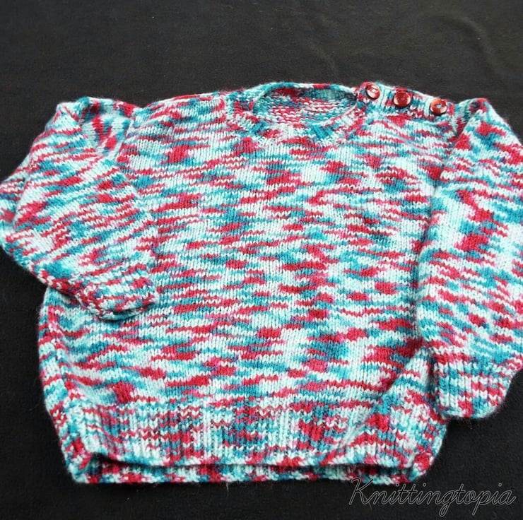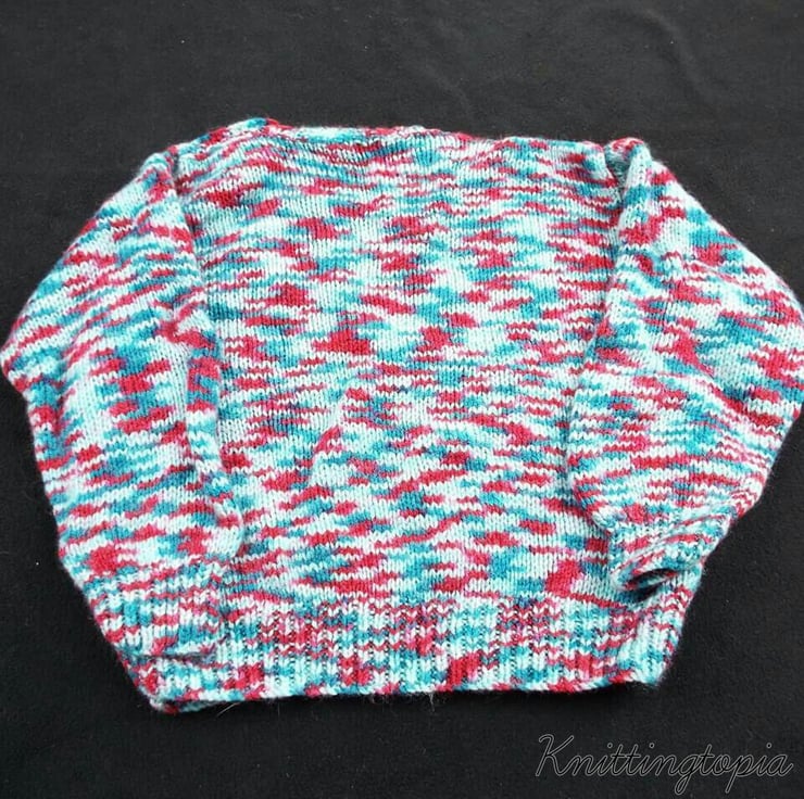 This jumper has been hand knitted using Robin yarn in a shade called Peacock which is a mixture of red and blue. It is a lovely mixture of colour for the Autumn months and would look great with a pair of jeans for those Autumn walks in the park.