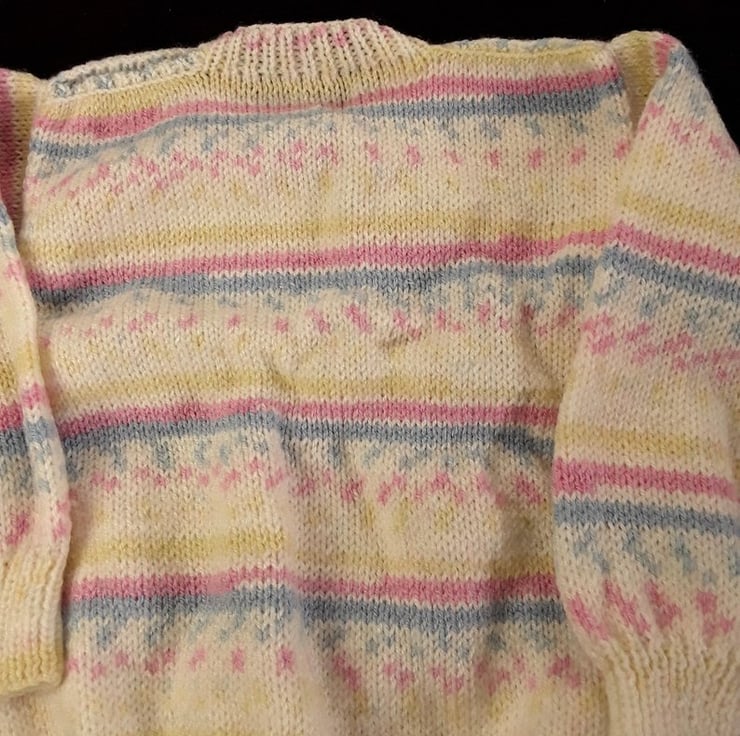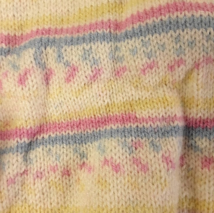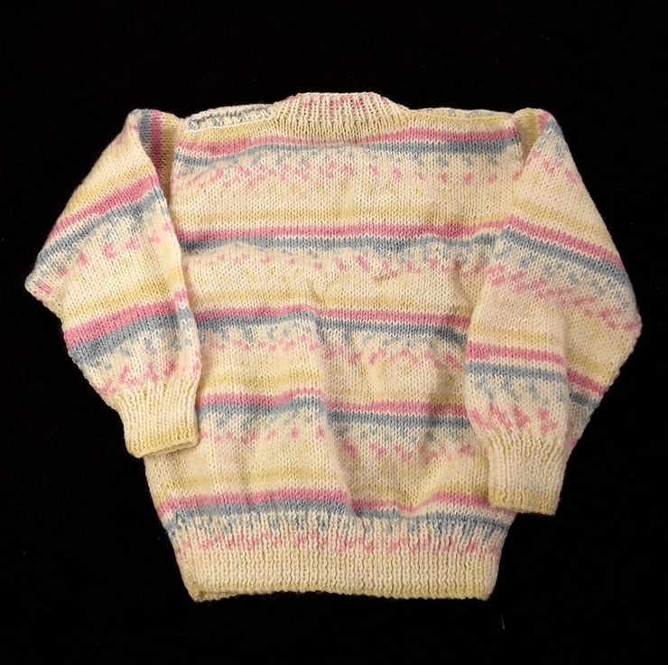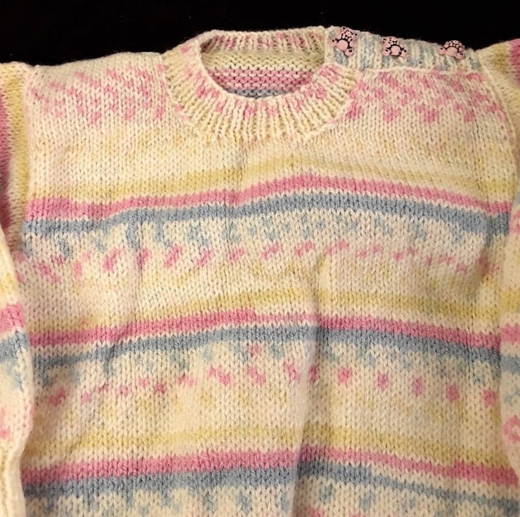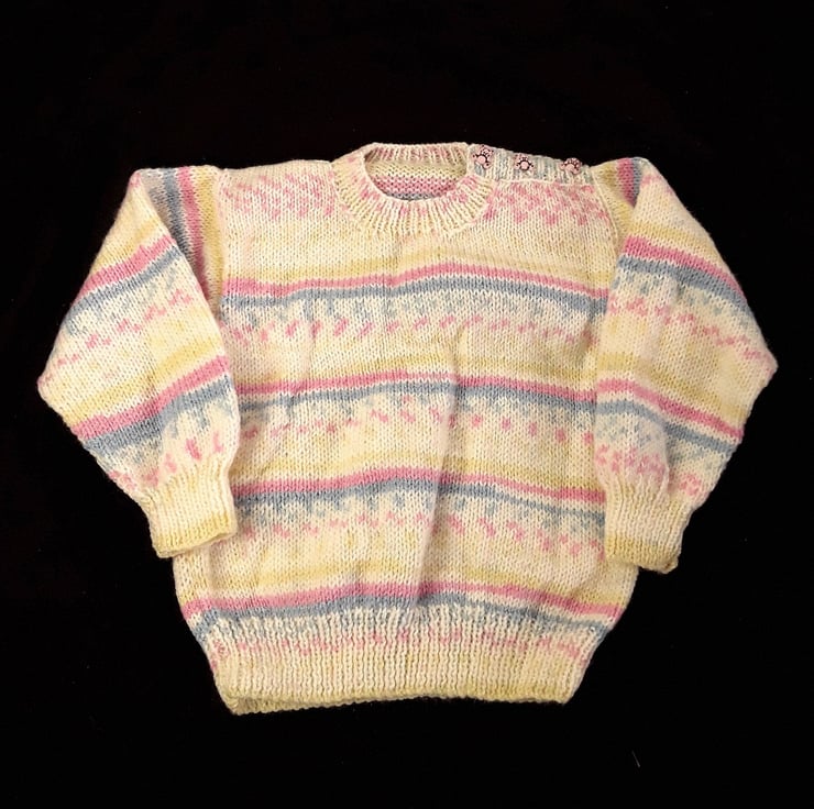 This jumper has been hand knitted using Baby Model which is a self striping yarn. The dominate colour is cream and it has flashes of pink, blue and yellow which produce their own pattern as it is knitted. This round neck jumper is knitted in a simple stocking stitch to show off the beauty of they yarn. The jumper fastens on the left shoulder with pale pink teddy shaped buttons.