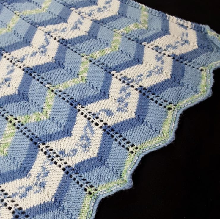 Hand-Knitted Baby Pram Blanket in Blue Chevron—an exquisite fusion of skillful craftsmanship and cozy comfort.