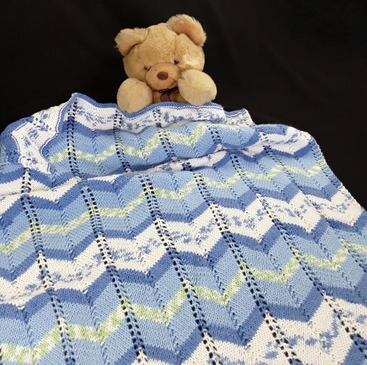 Envelop your baby in the comforting warmth of this beautiful pram blanket, meticulously created through hand-knitting with a self-patterning Aran yarn. The yarn seamlessly blends shades of blue, green, and white, forming an enchanting chevron knit pattern.