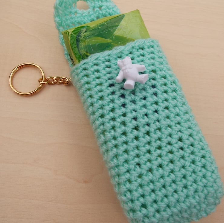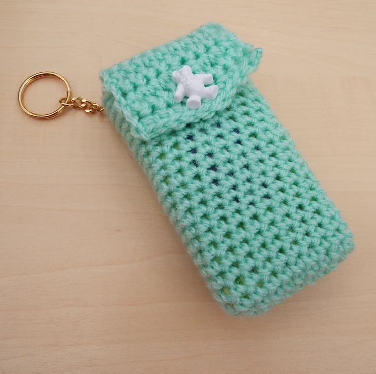 Hand crochet pocket tissue cover keyring - green with white teddy button