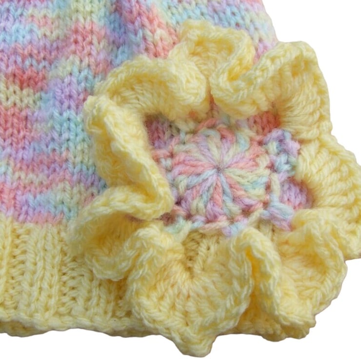 This soft and snuggly hand-knitted baby beanie is crafted in gentle pastel shades with a sweet crochet flower appliqué for an extra special touch. Made from soft acrylic yarn, it's warm, lightweight, and perfect for newborns.