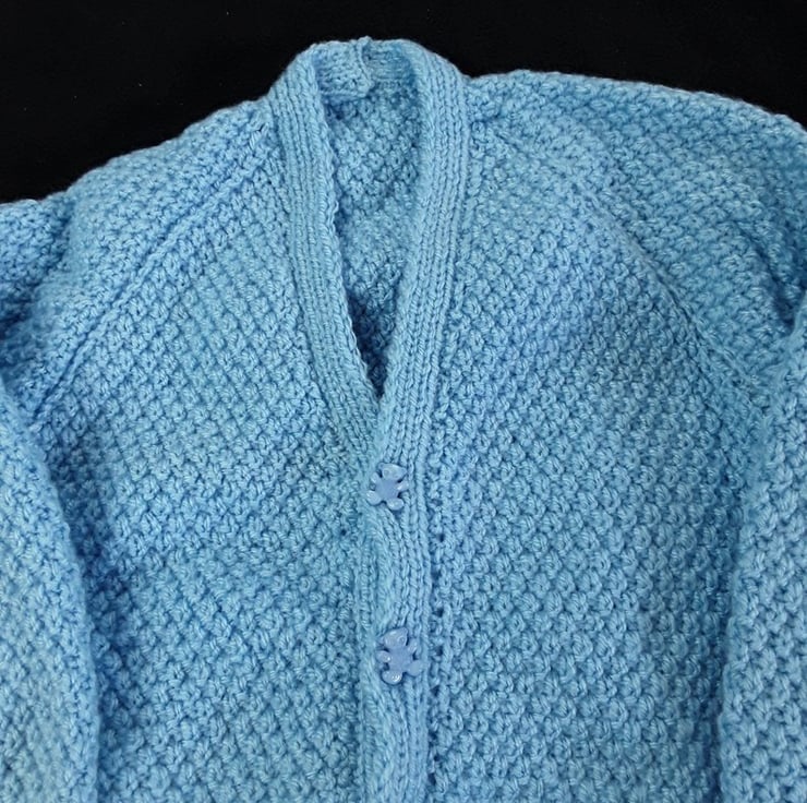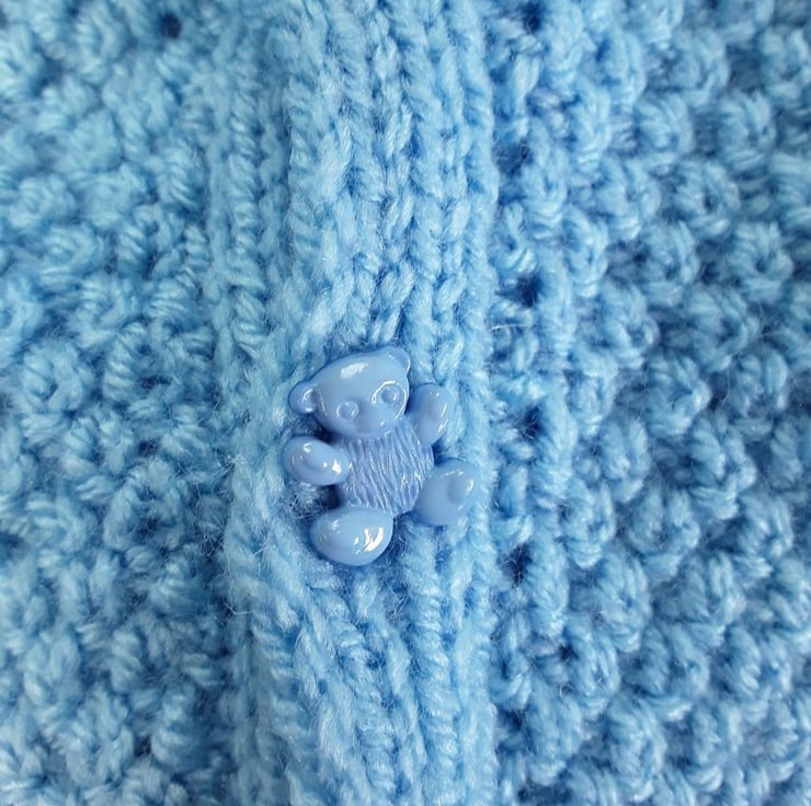 This baby cardigan has been hand knitted in a lovely blue and has an all over textured pattern. It has a V neckline and fastens down the front with blue teddy shape buttons.