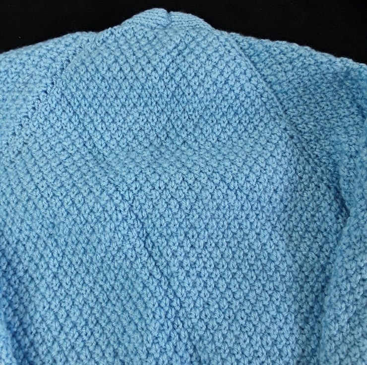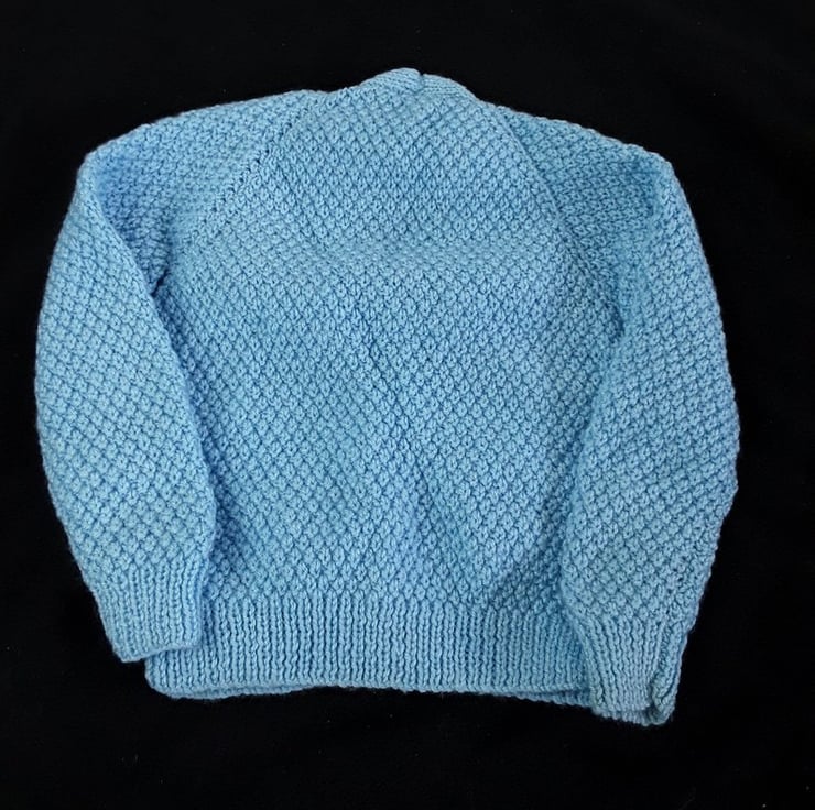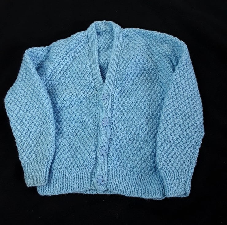 Hand knitted baby v neck cardigan knitted in blue 24 inch chest