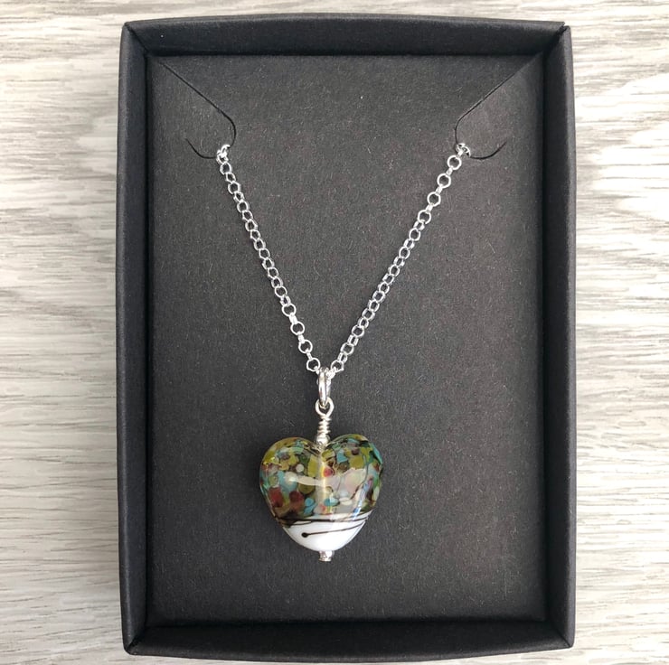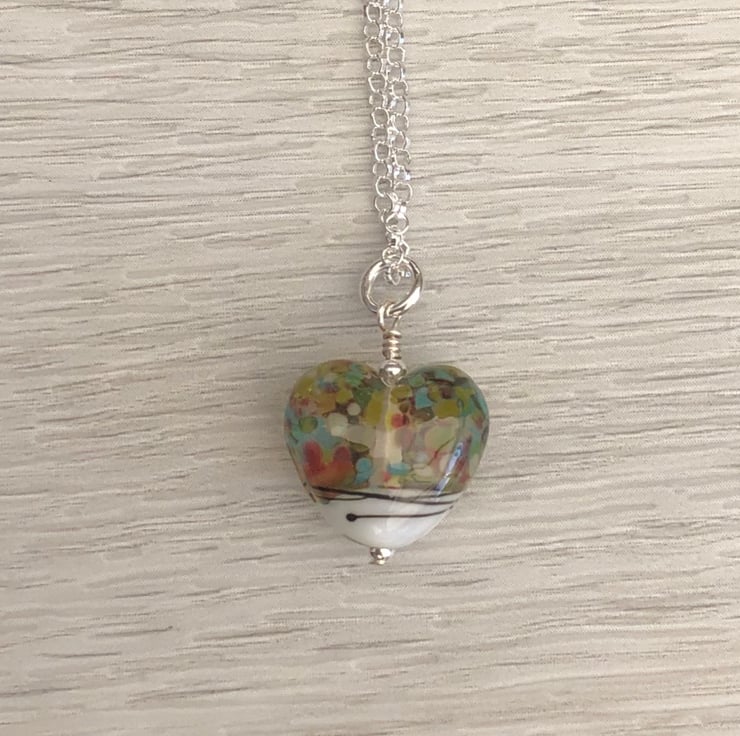 Clear glass with a white bottom, specks of olive, blue and pink. A stunning bead made to order from a UK glass artisan.