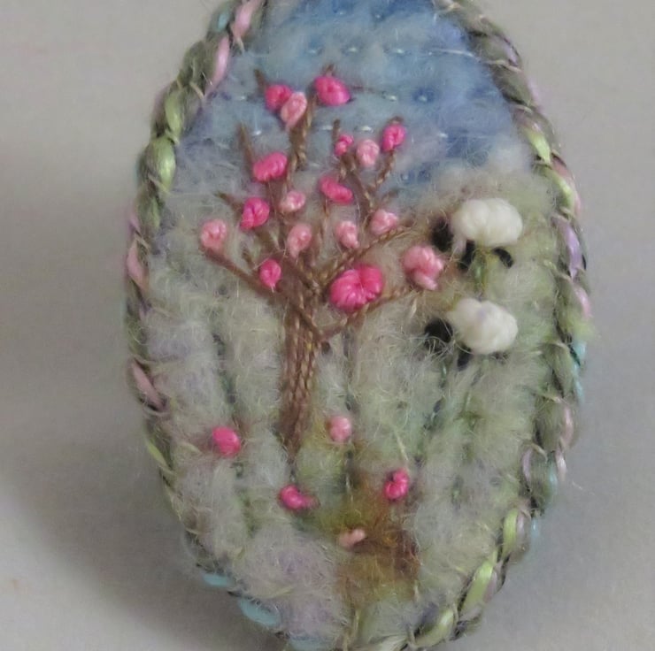 The background of the brooch has been created from hand-dyed fibres felted to a layer of fleece fabric. The sheep and blossoms have been stitched in wools and embroidery threads.