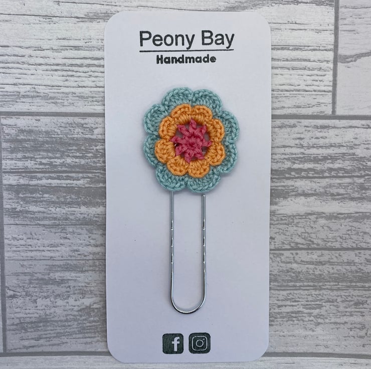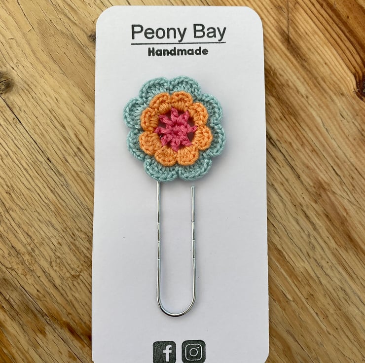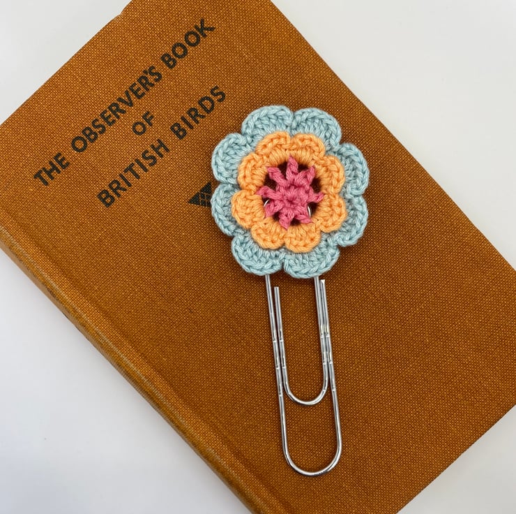 To make this bookmark I chose three colours of cotton to crochet with. Starting with pink I crocheted the first two rounds of the flower. I crochet over the top of the bookmark so the flower is perfectly secure, it does move but it can’t come off (unless you slide it along the shape of the bookmark!). For the third and fourth rounds I used peach cotton, the third round creates a base layer to create the shape of the petals in the fourth round. I then changed to a pastel blue cotton for the fifth and sixth rounds, these are similar to the previous two rounds with increased stitches to make the petals larger.