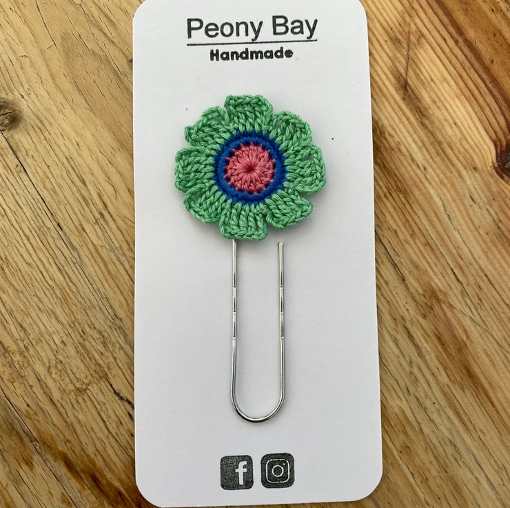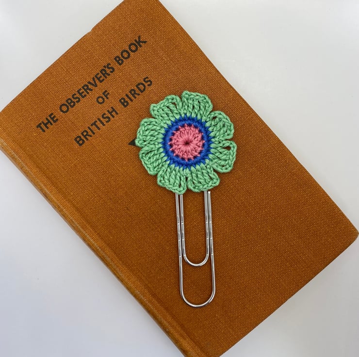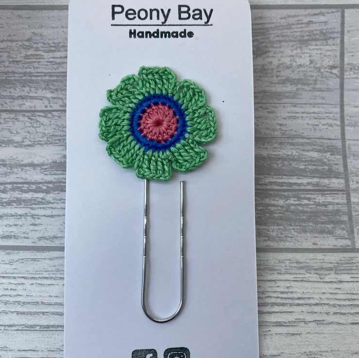 To make this pretty bookmark I used pink cotton to crochet the centre of the flower, then blue, then I crocheted 8 petals in the green cotton. I crochet over the top of the bookmark so the flower is perfectly secure, it does move but it can’t come off (unless you slide it along the shape of bookmark!).