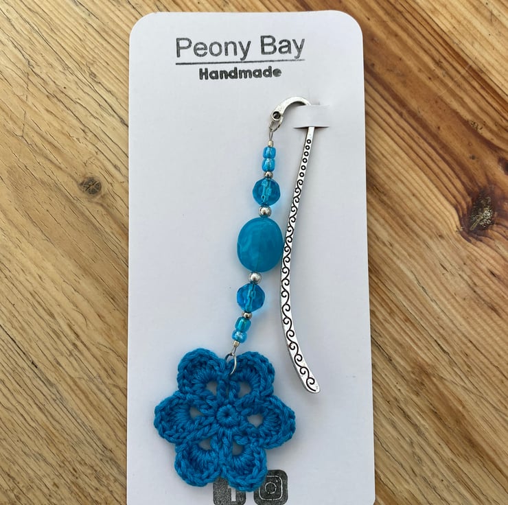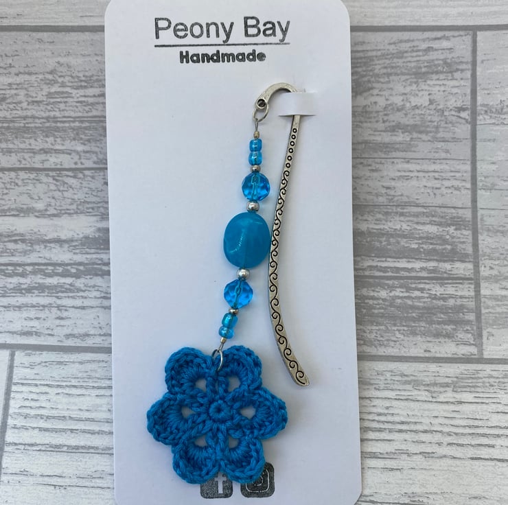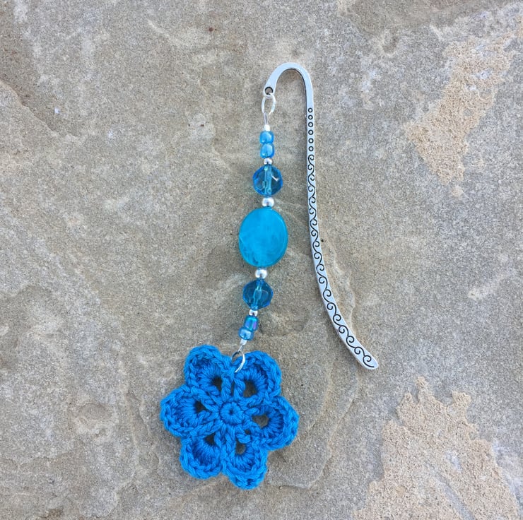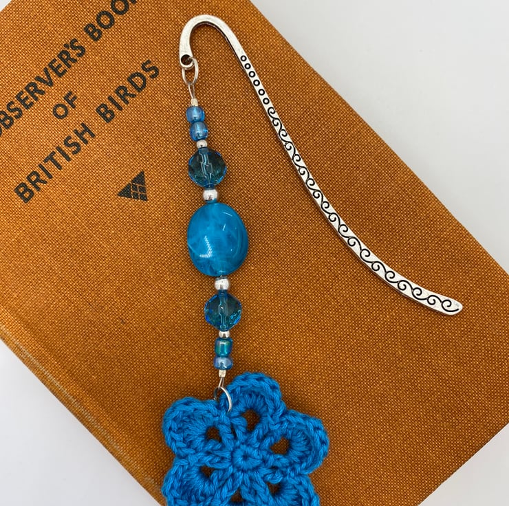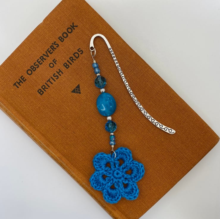 To make this bookmark I’ve combined a crocheted flower and upcycled beads. I crocheted the flower in a bright blue cotton, added a mixture of blue, turquoise and silver beads and set it on a silver tone bookmark. The main oval bead has a swirly pattern reminiscent of water, the beads either side are faceted. I like these colours and find it very calming.