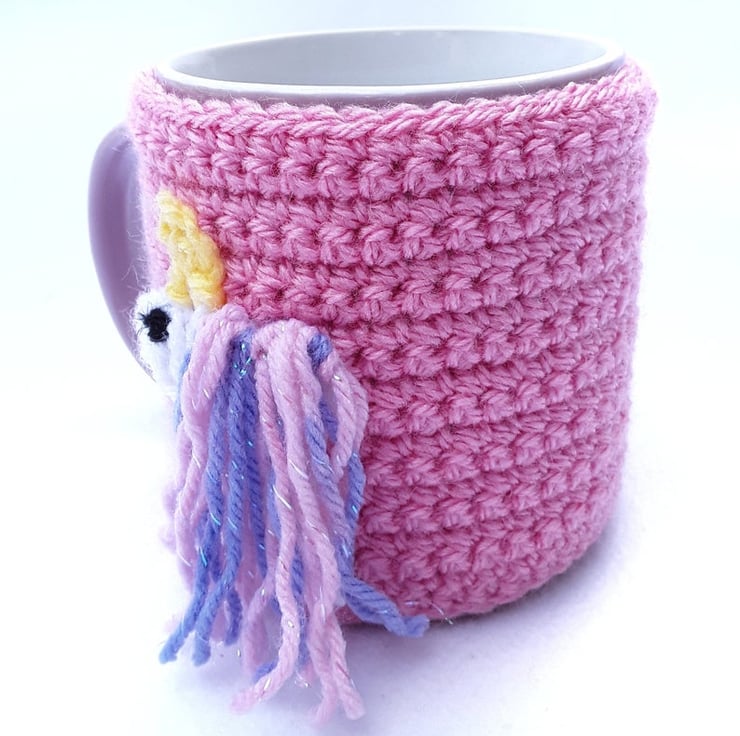 Hand crocheted mug cosy - pink with white unicorn with pink and blue sparky mane - stocking filler - mug cosies - mug hug - gifts for her