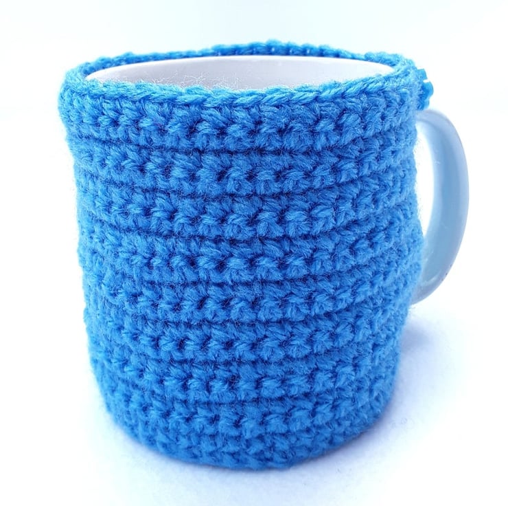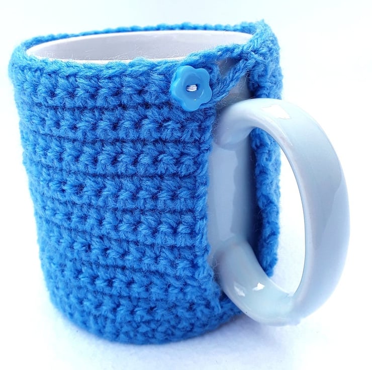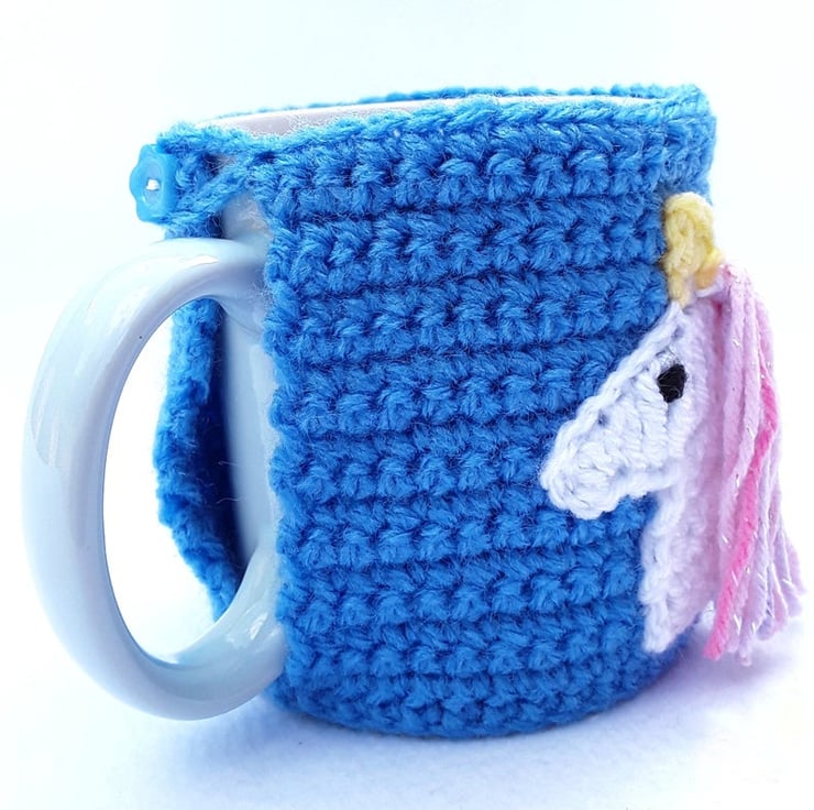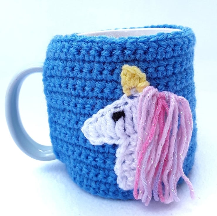 Blue unicorn lovers mug cosy crocheyed by hand. A beautiful mid blue yarn has been used to crochet the mug cosy and a white unicorn with it's yellow horn adorns the front. For the free flowing mane i have used a pink and blue variegated yarn which has a sparky thread because we all know unicorns sparkle. Due to the nature of the yarn and the colour changes, this mane has ended up mainly pale pink with a splash of a darker pink and just a hint of blue. The mug cosy has a crocheted loop which fits over the mug handle and fastens around a blue flower shaped button. This would make a lovely gift and is a great stocking filler for Christmas.