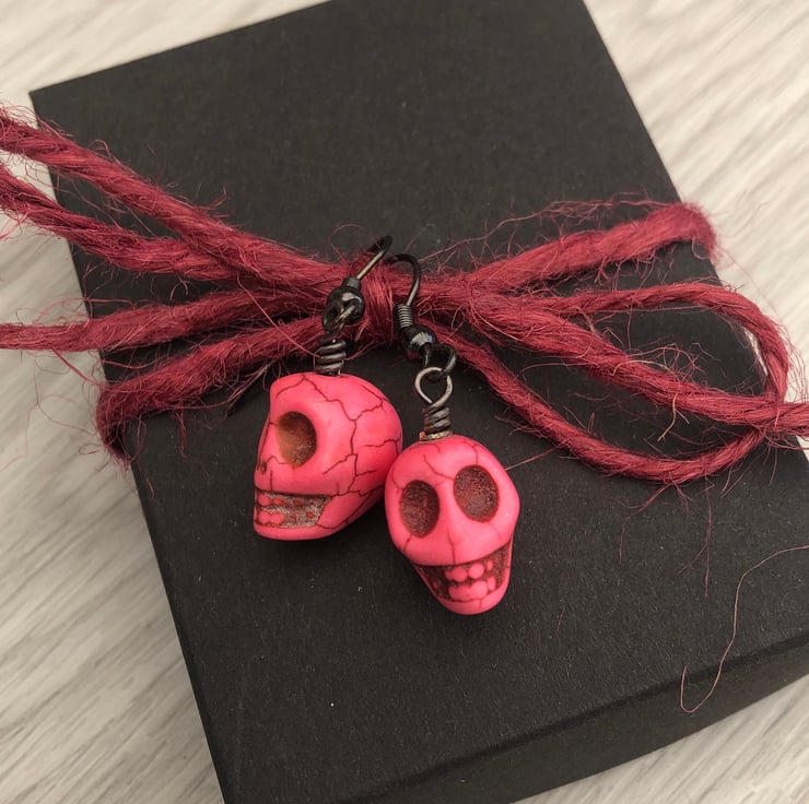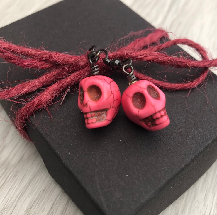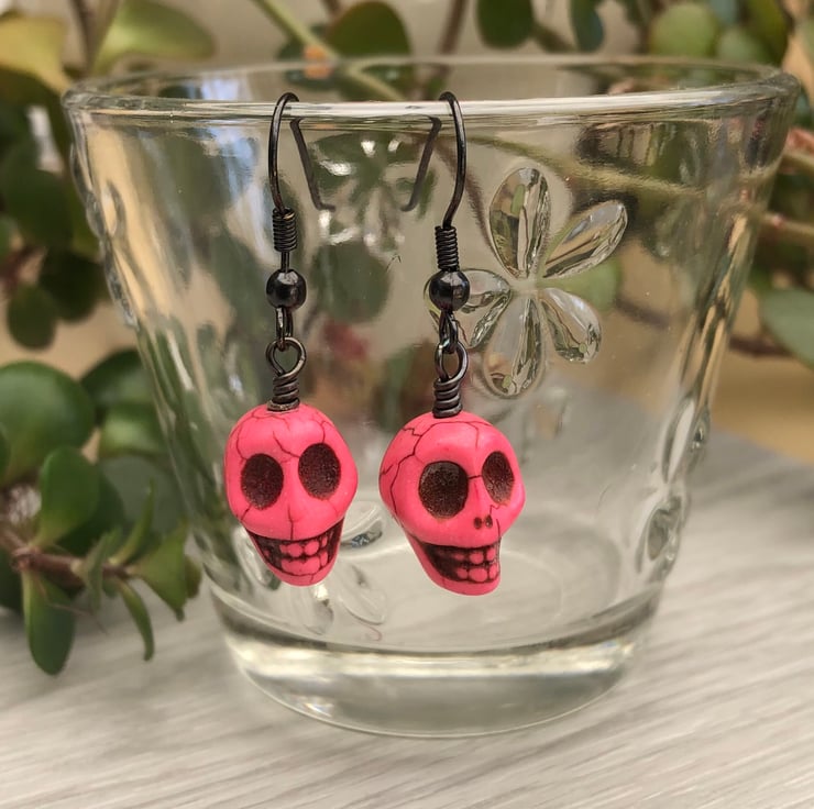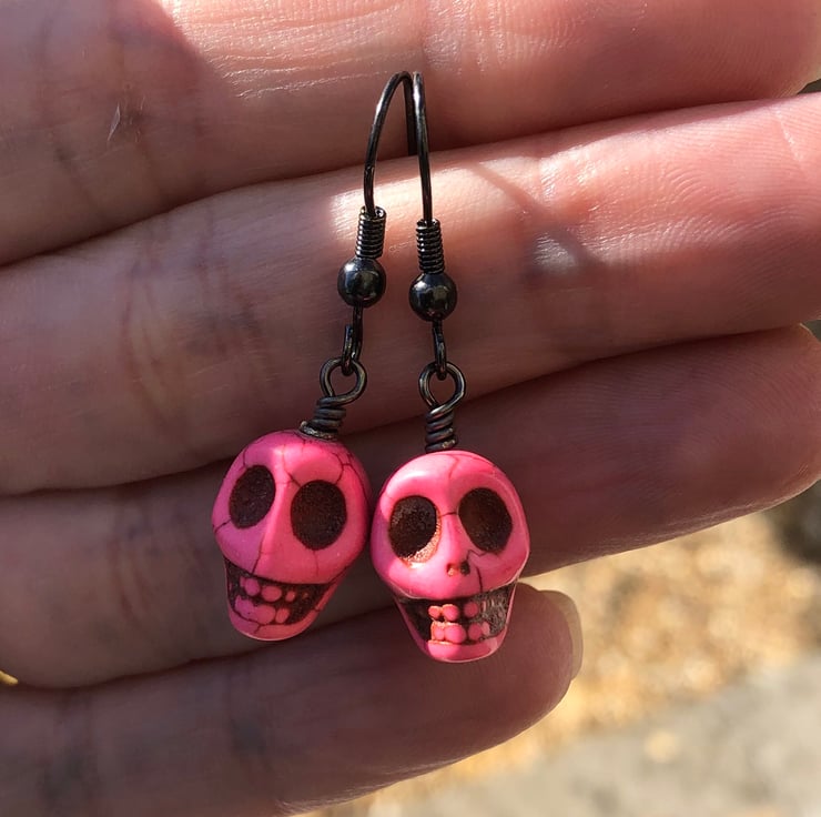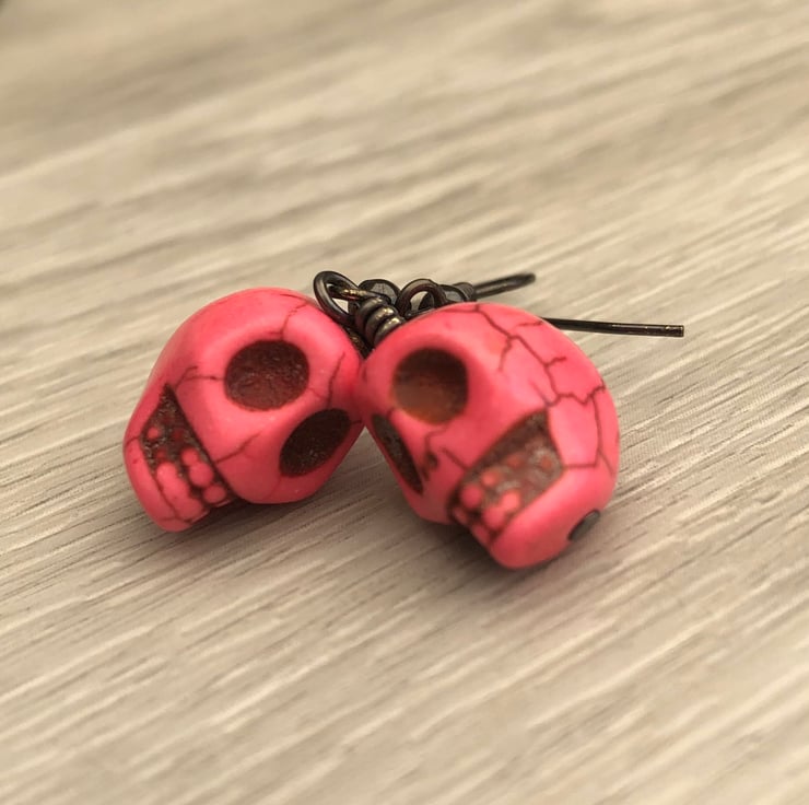 Hot pink howlite candy skull charms have been added to antique black brass earrings.