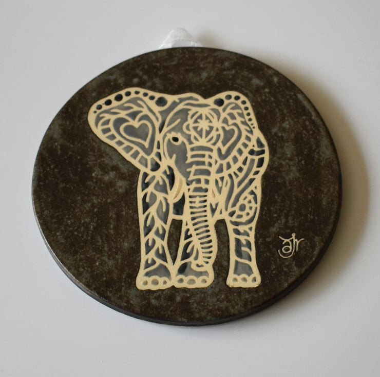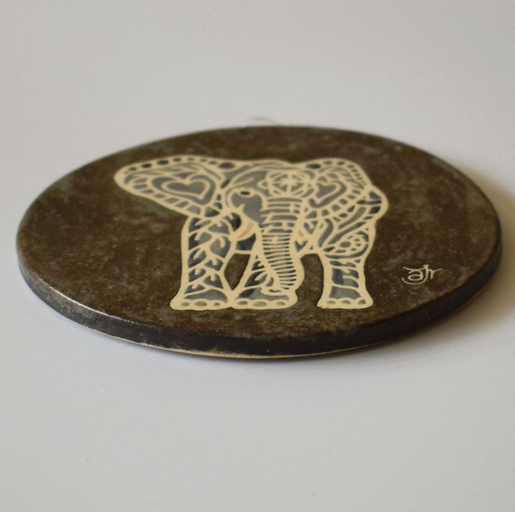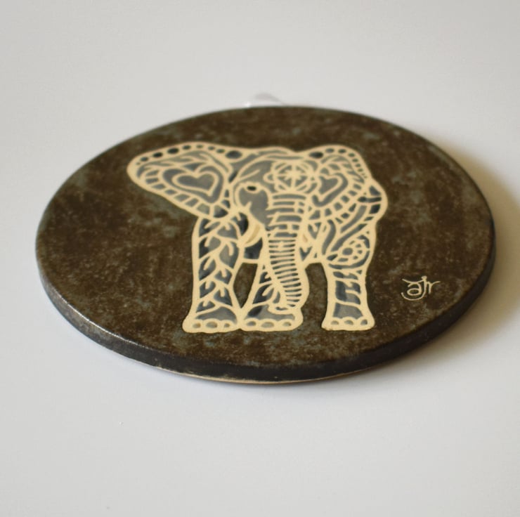 A hand thrown round plaque or coaster measuring 11cm diameter with a stencilled African elephant in satin matte glaze.