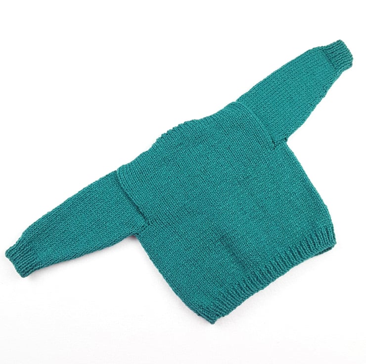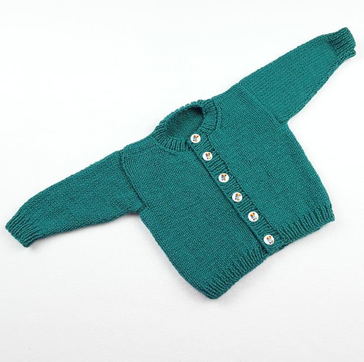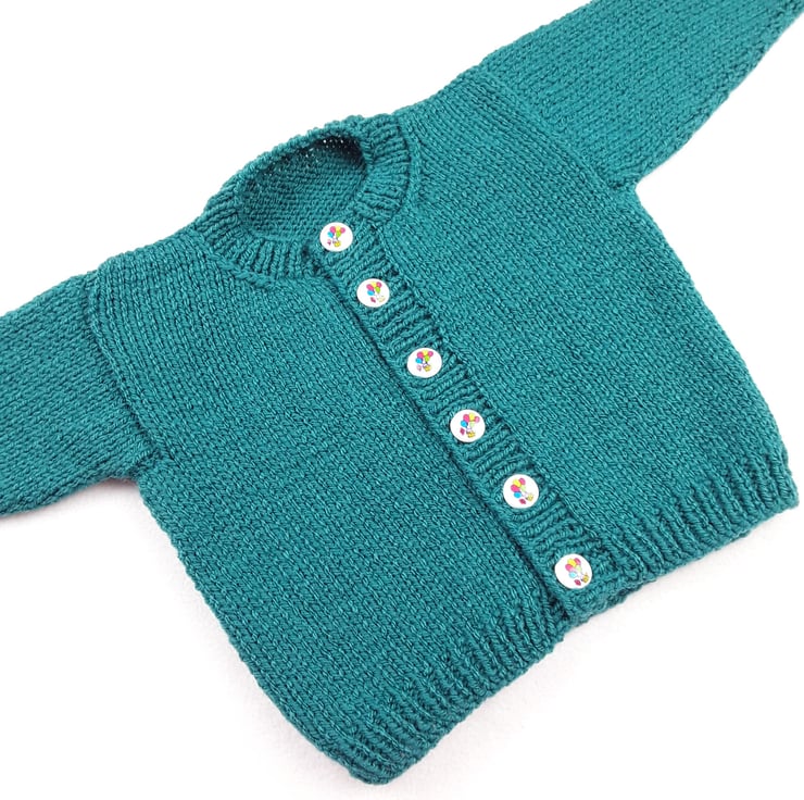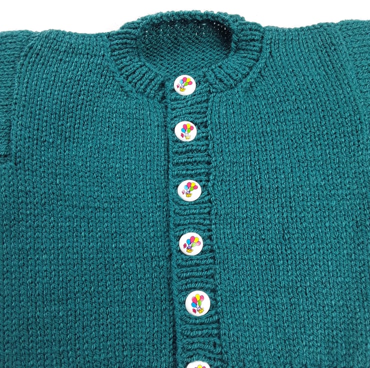 This baby's cardigan has been knitted to a classic round neck style using a beautiful sea green yarn. It fastens fully down the front with white buttons which have pictures of balloons on.