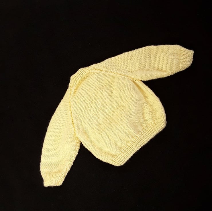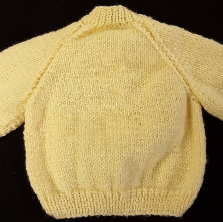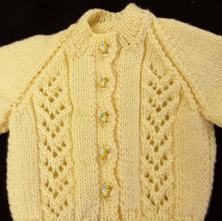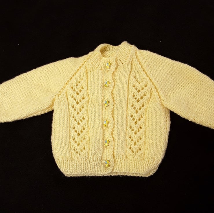 This baby cardigan has been hand knitted using a soft lemon yarn so it's suitable for both boys and girls. It has a V neckline and a lacy knit panel to the fronts. It fastens down the front with lemon buttons.