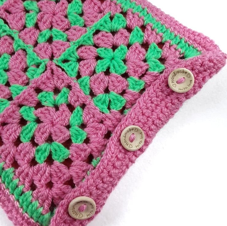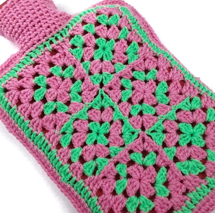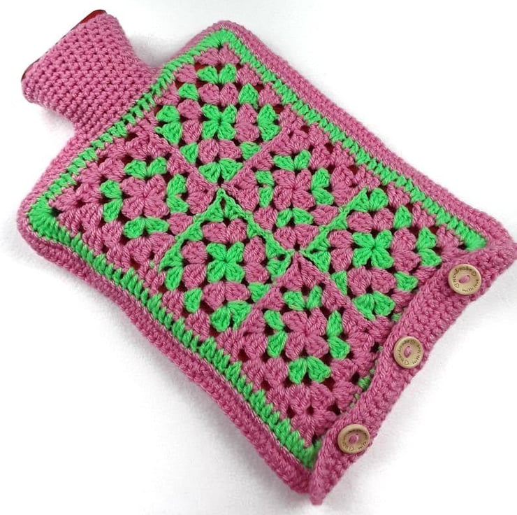 Besides keeping you warm, a hot water bottle is great for pain relief. So the last thing you want to do is burn yourself. This cosy has been hand crocheted using the traditional granny square so it has a vintage style to it. The neck has been left open so easy access for filling your bottle without removing the cover. There are three wooden 'handmade with love' buttons along the bottom to allow the cover to be removed for washing.