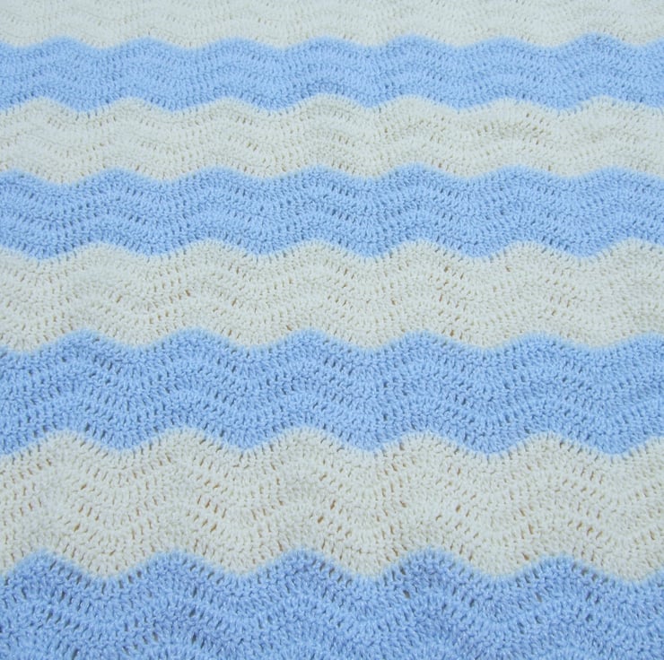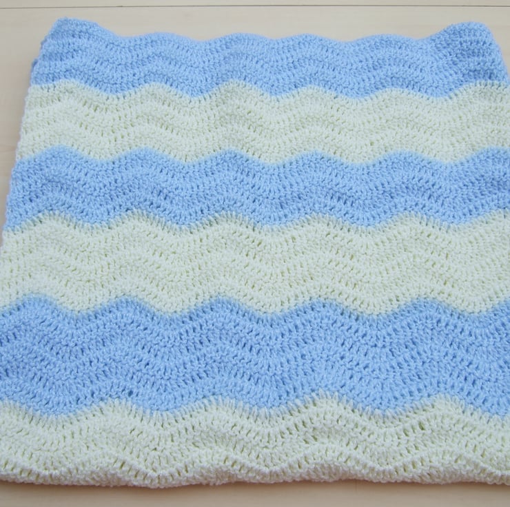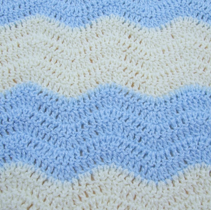 Crafted in a charming ripple pattern, this blanket features alternating soft waves with six rows of each color, adding a whimsical touch. Its dimensions make it a versatile piece, serving as a practical cot cover, pram cover, car seat cover, or a cozy wrap for baby during snuggle time.