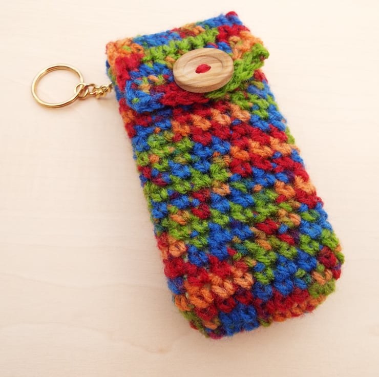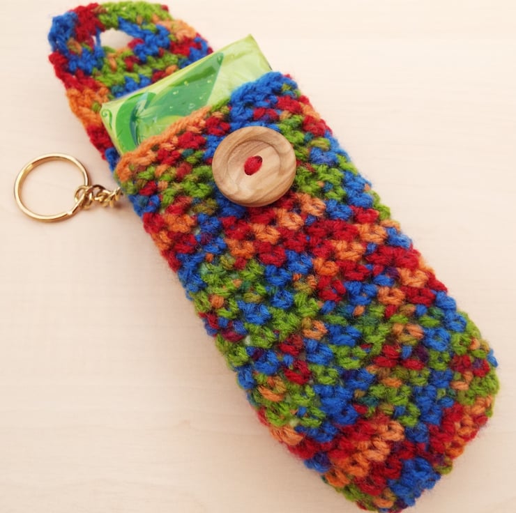 Hand crochet pocket tissue cover keyring - multicolour mix with wooden button