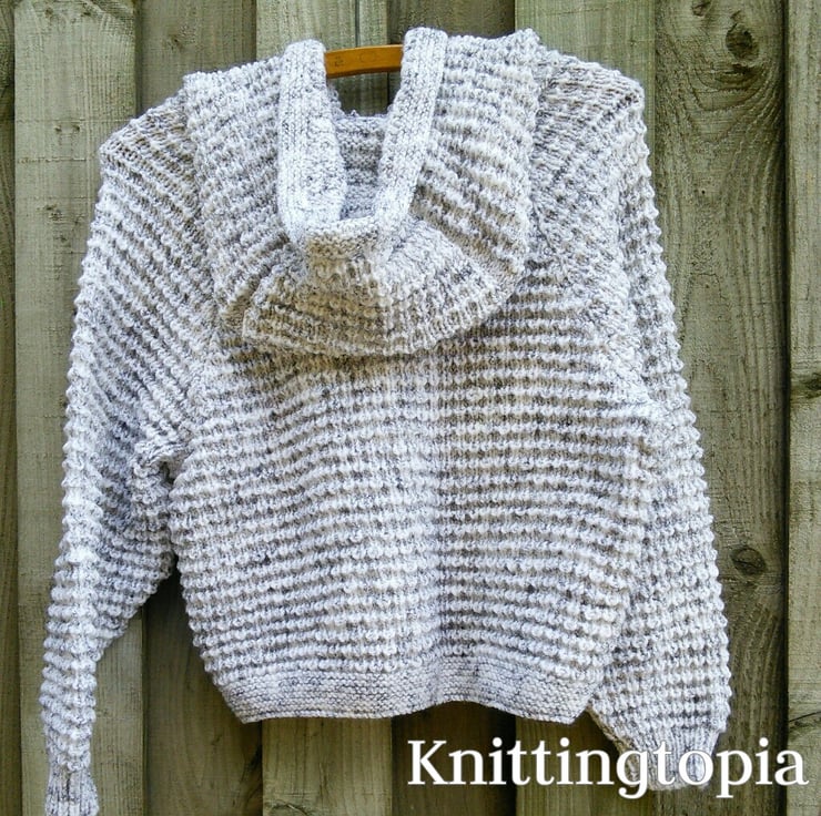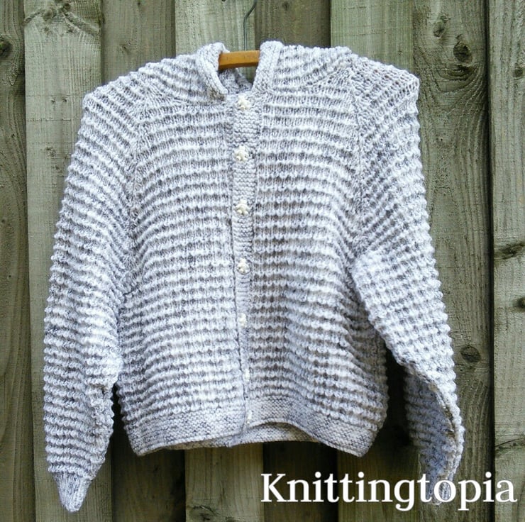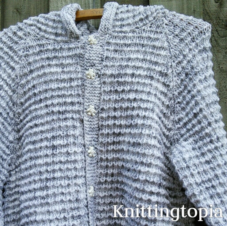 This boys hooded cardigan has been knitted using Sirdar Bonus DK yarn in 'stormcloud'. Stormcloud is a white yarn with wispy flecks of black. The jacket has an all over textured pattern and is finished off with 7 white teddy buttons down the front. The buttons are on the right hand side with is traditionally the boys side but a girl could equally wear this.