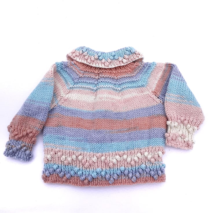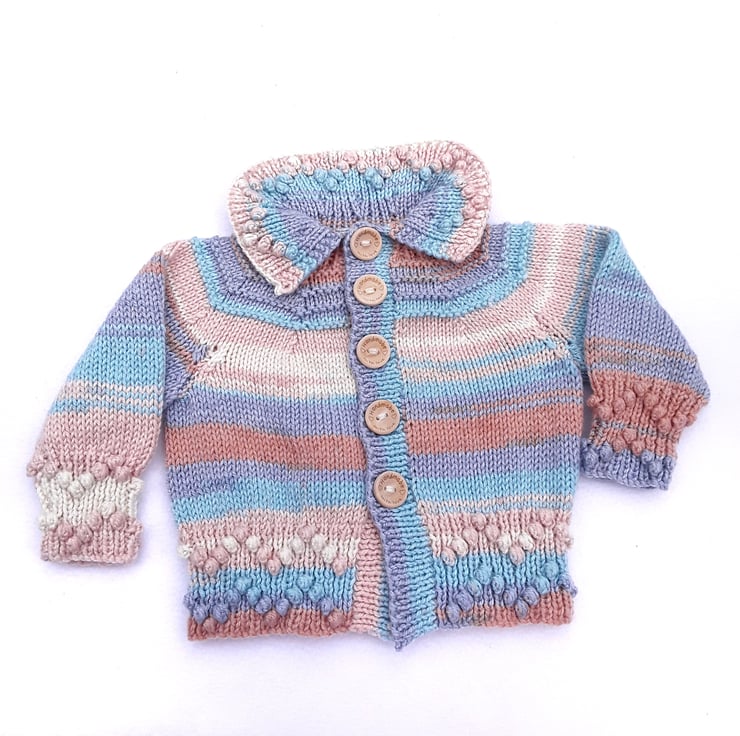 This baby cardigan has two rows of bobbles on the cuffs and hemline and one row on the collar. The bobbles form a zigzag design in the ribbing. The cardigan has been hand knitted using a shade of yarn called Bondi beach and is shades of blues and browns it represent the sea and sand. Wooden buttons with 'Handmade with love' on them fasten the cardigan down the chest.