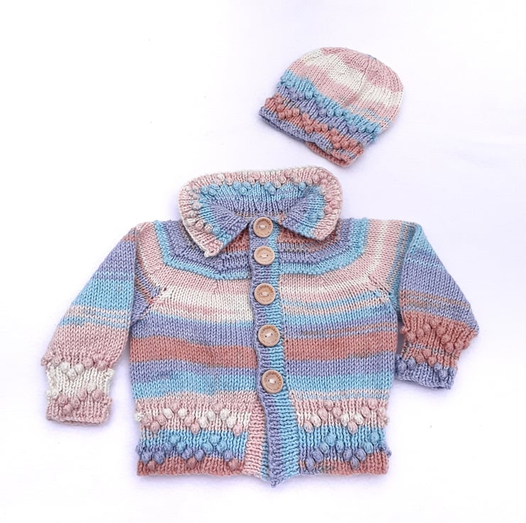 Hand knitted baby cardigan and hat 0 - 6 months - baby clothes matinee set - knitted baby clothes - baby clothing - blues and browns