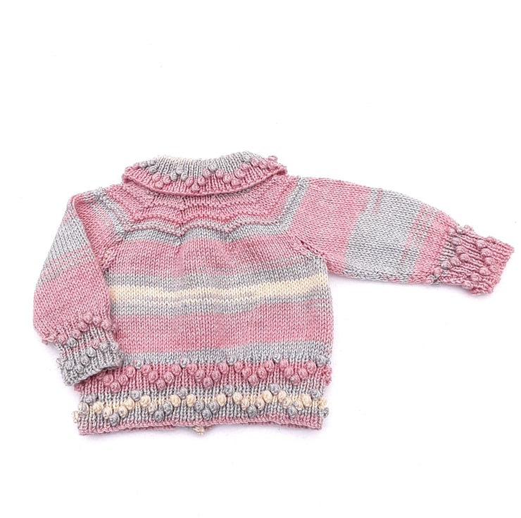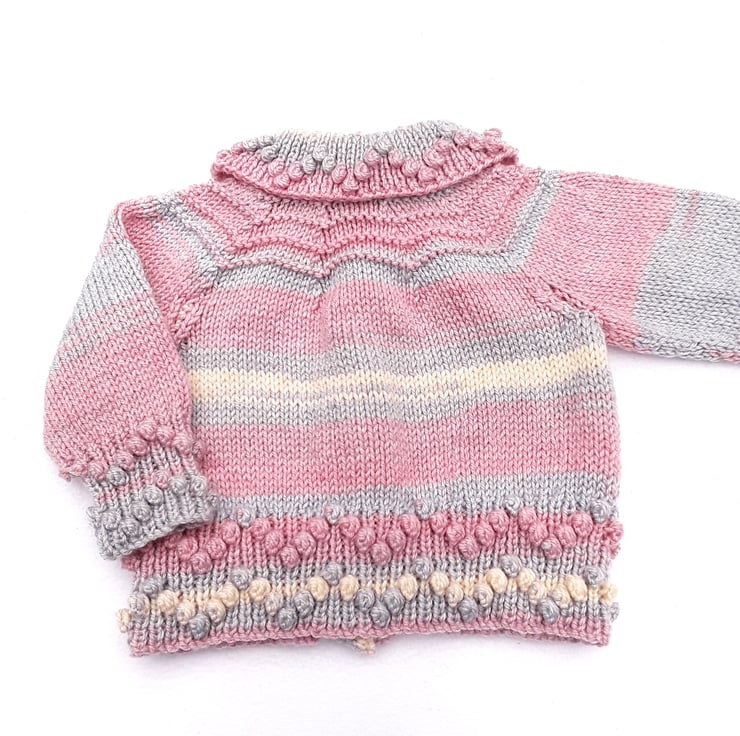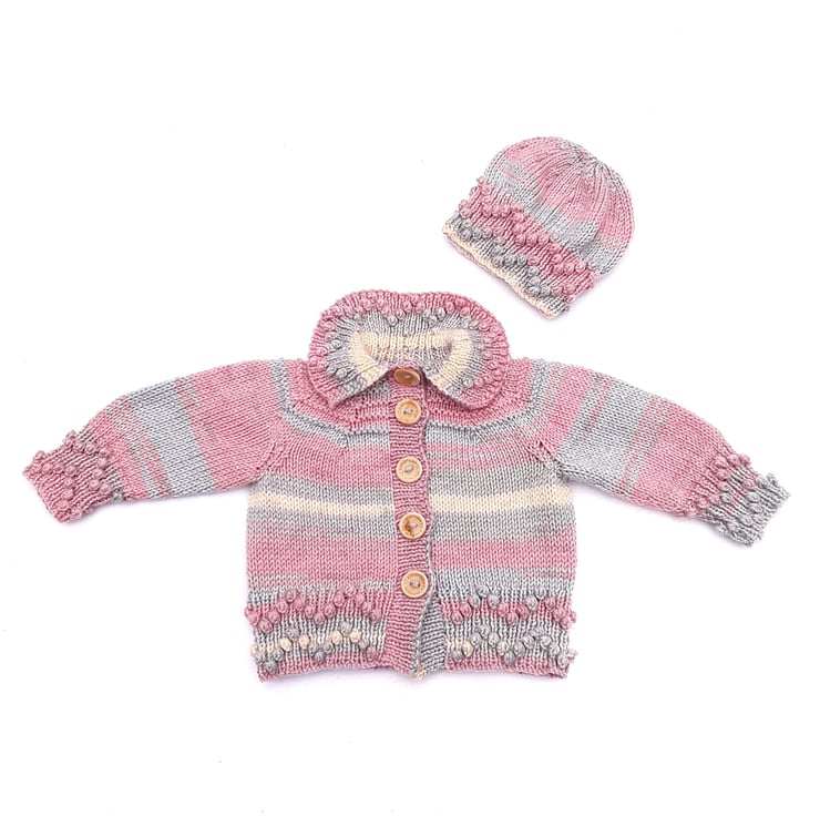 Hand knitted baby bobbly trim cardigan and hat 0 - 6 months - baby clothes matinee set - knitted baby clothes - baby clothing - pink and grey.