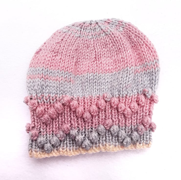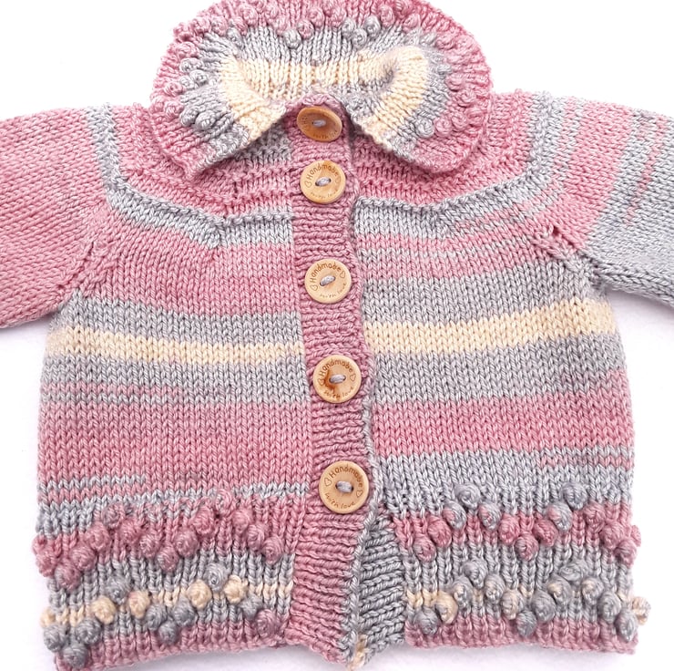 This baby cardigan and matching hat have been knitted in a shade called pebble beach. It is a variegated yarn in a dusky pink, grey and cream - just like pebbles. It is a collared cardigan with a round neckline. The cardigan cuffs, hemline and collar have a bobble design knitted into the rib. The small bobbles form two rows of zigzags on the sleeves and hem and one row on the collar. Wooden buttons with 'Handmade with love' on them fasten the cardigan down the chest.