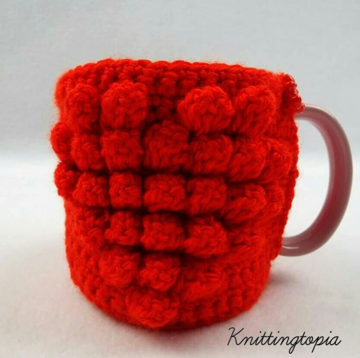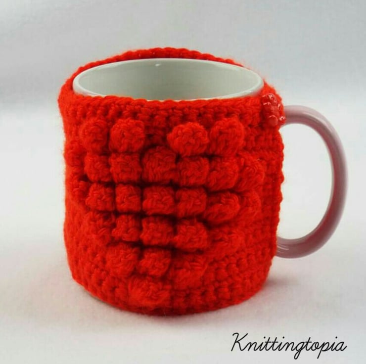 Crocheted in red yarn, this beautiful mug cosy is just what you need to keep your cuppa warm. It also helps to stop you burning your hands too! It's hand crocheted with a love heart on both sides worked in a bobble stitch. It has a crocheted loop which fits over the mug handle and fastens around a button. This would make a great gift for Valentine's Day or Mother's Day.