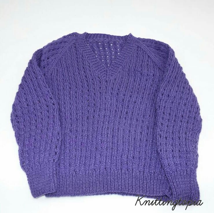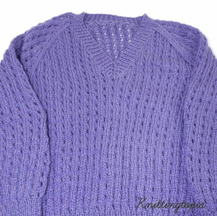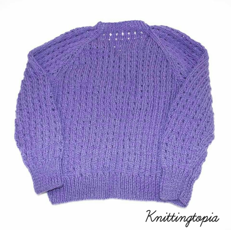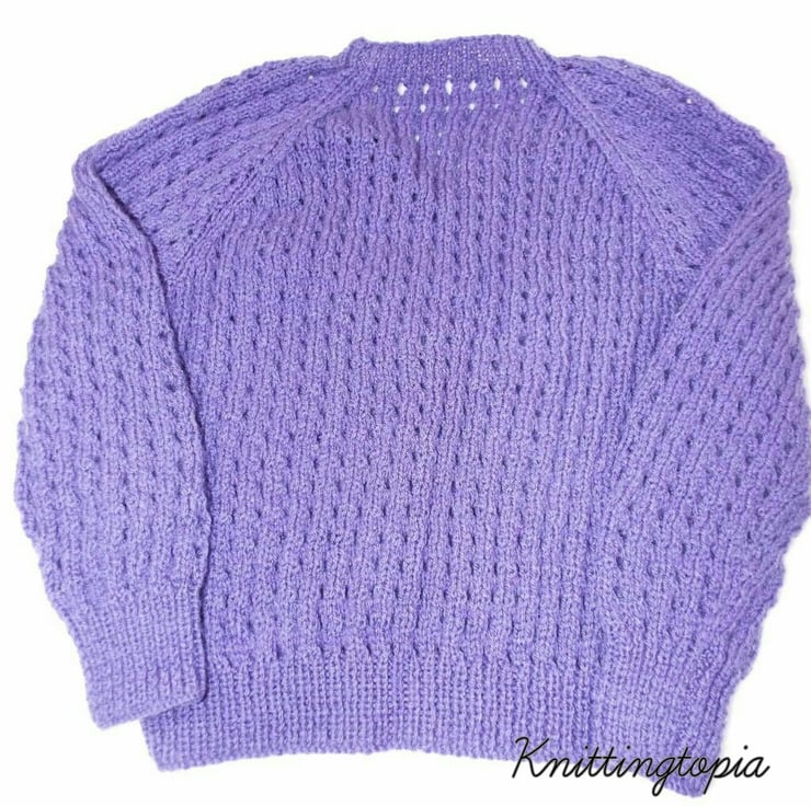 This children's sweater has been hand knitted using a lovely purple shade of yarn. The jumper has a classic V neck and an all over eyelet pattern.