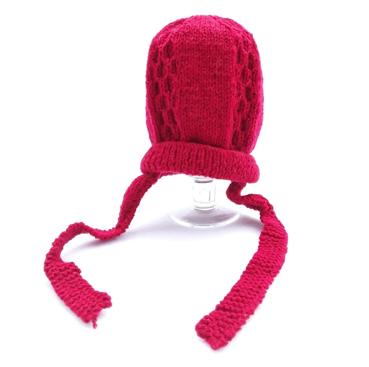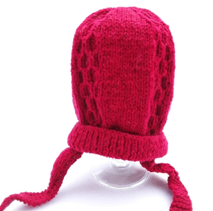 The hat is fashioned from a deep red/burgundy yarn, presenting a rich and inviting hue that catches the eye. It showcases a charming cabled honeycomb pattern, adding a touch of classic style to your baby's look. The design incorporates sweet ear flaps to ensure your baby's ears stay toasty, while ties can be fastened under the chin for a secure and comfortable fit.