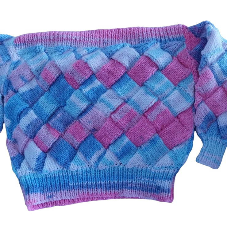 Add a touch of fun to your little one’s wardrobe with this hand-knitted baby jumper featuring a sparkly pink and blue entrelac design! Ideal for children aged 2-3 years, this jumper is both cosy and playful. The unique entrelac pattern creates a striking woven effect, beautifully showcasing the vibrant variegated yarn.