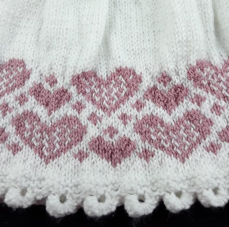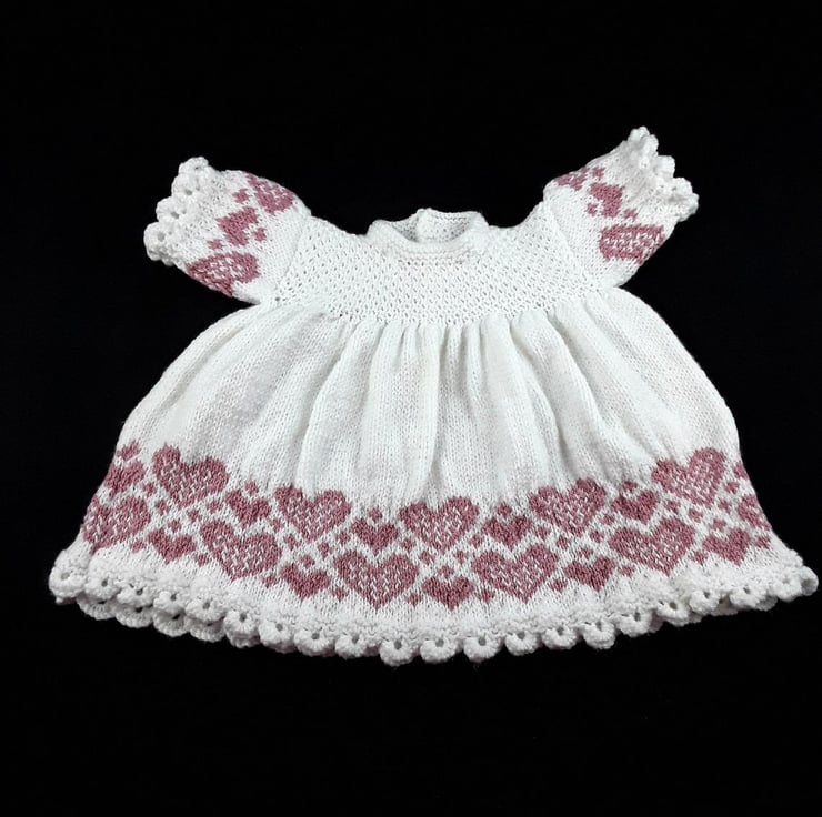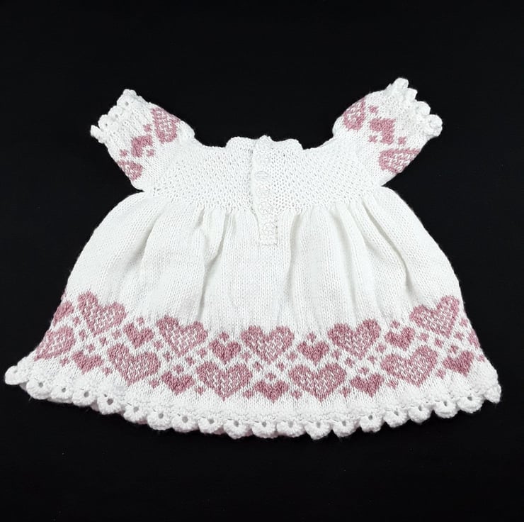 This beautiful hand knitted baby dress set has a valentine's day theme with it's pink hearts design.
