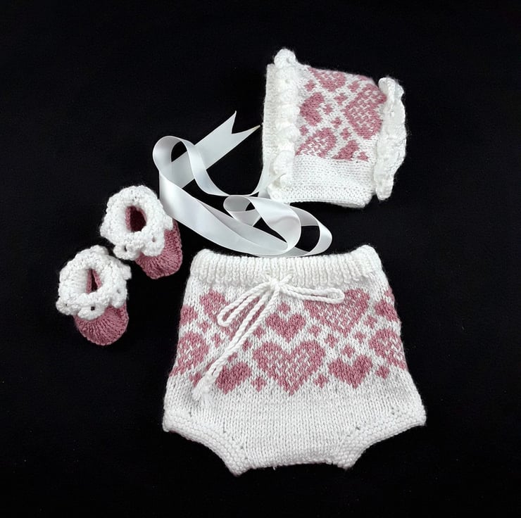 Hand knitted baby dress set, white with fairisle rose pink hearts, matching bonnet, booties, pants, 0 - 3 month baby, 20" - 22" reborn doll