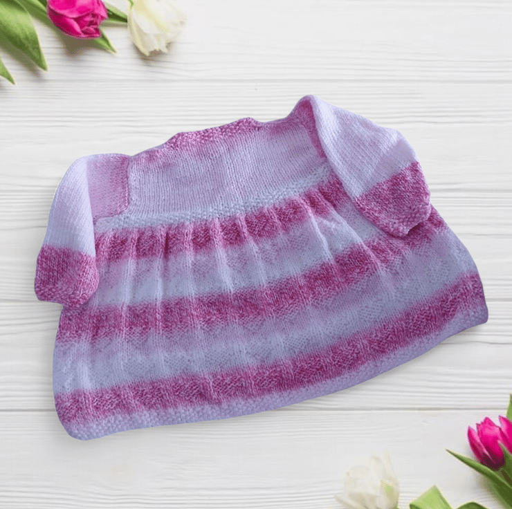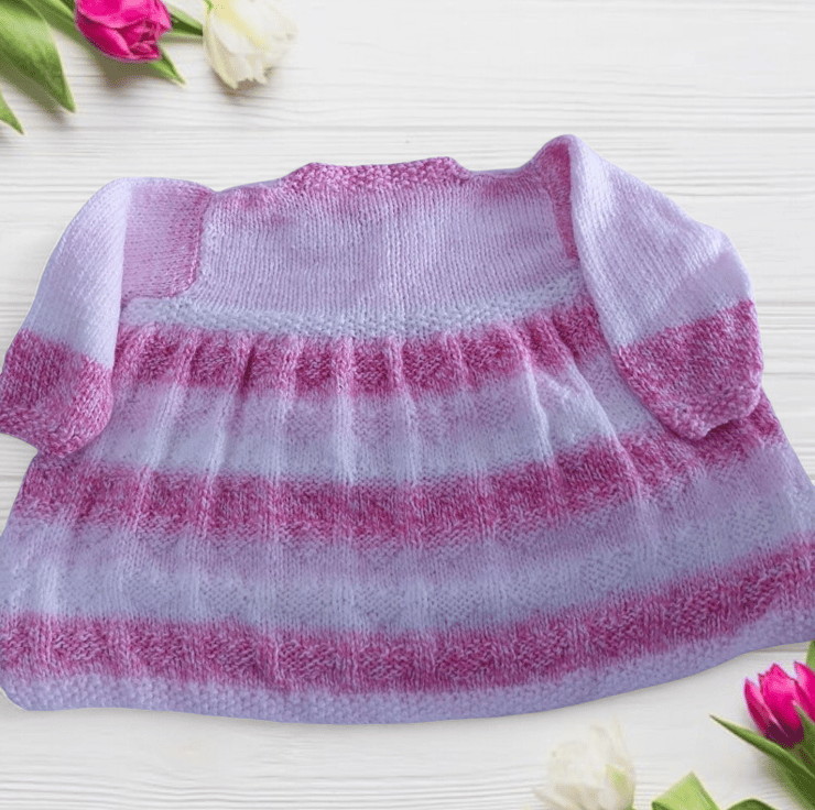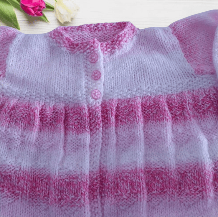 Made with Hayfield Baby Changes yarn, the cardigan smoothly shifts from white to pale pink, finishing with a blend of deeper pink and white. The colour-changing effect adds a special touch!